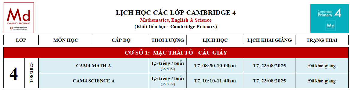 LỊCH KHAI GIẢNG CÁC LỚP CAMBRIDGE 4 TẠI CƠ SỞ MẠC THÁI TỔ (CẦU GIẤY)
