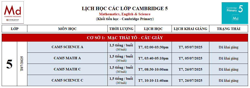 Quý phụ huynh học sinh quan tâm có thể tham khảo kỹ các thông tin khóa học Cambridge 5 và lịch khai giảng dự kiến dưới đây: