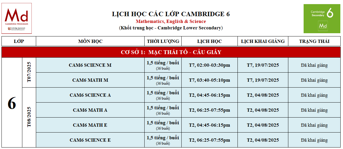 LỊCH KHAI GIẢNG CÁC LỚP CAMBRIDGE 6 TẠI CƠ SỞ MẠC THÁI TỔ (CẦU GIẤY)