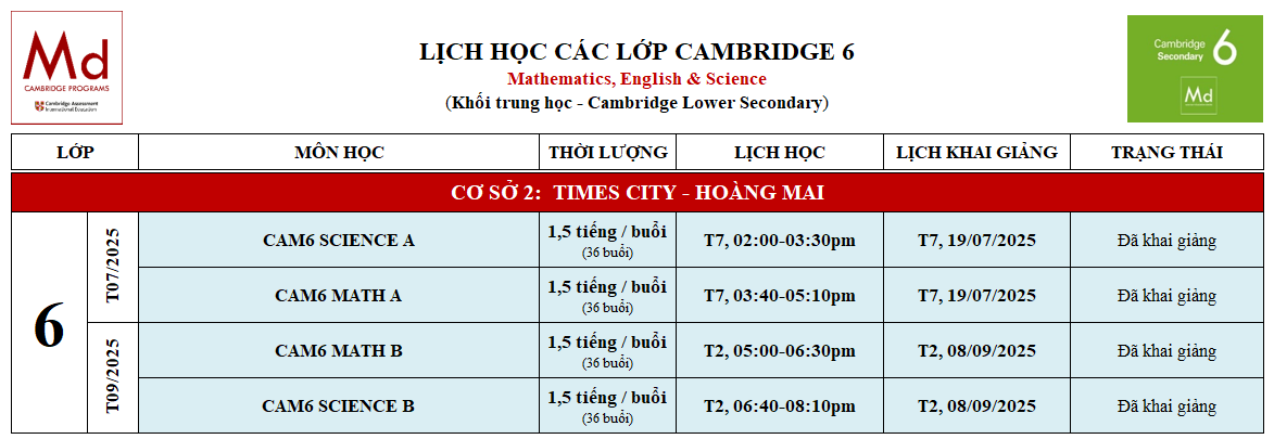 LỊCH KHAI GIẢNG CÁC LỚP CAMBRIDGE 6 TẠI CƠ SỞ TIMES CITY (HOÀNG MAI)