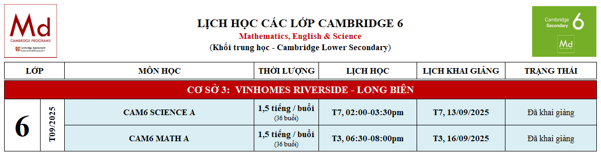 LỊCH KHAI GIẢNG CÁC LỚP CAMBRIDGE 6 TẠI CƠ SỞ SYMPHONY (LONG BIÊN)