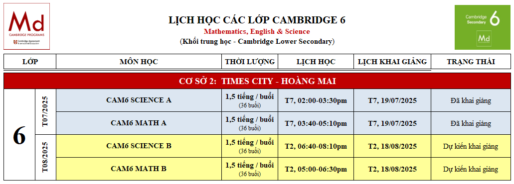 LỊCH KHAI GIẢNG CÁC LỚP CAMBRIDGE 6 TẠI CƠ SỞ TIMES CITY