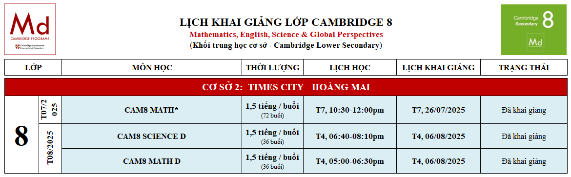 LỊCH KHAI GIẢNG CÁC LỚP CAMBRIDGE 8 TẠI CƠ SỞ TIMES CITY (HOÀNG MAI)