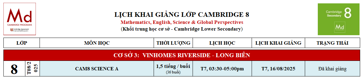 LỊCH KHAI GIẢNG CÁC LỚP CAMBRIDGE 8 TẠI CƠ SỞ SYMPHONY (LONG BIÊN)