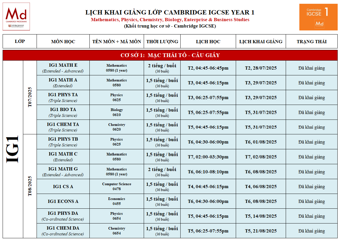 LỊCH KHAI GIẢNG CÁC LỚP CAMBRIDGE IGCSE YEAR 1 TẠI CƠ SỞ MẠC THÁI TỔ (CẦU GIẤY)