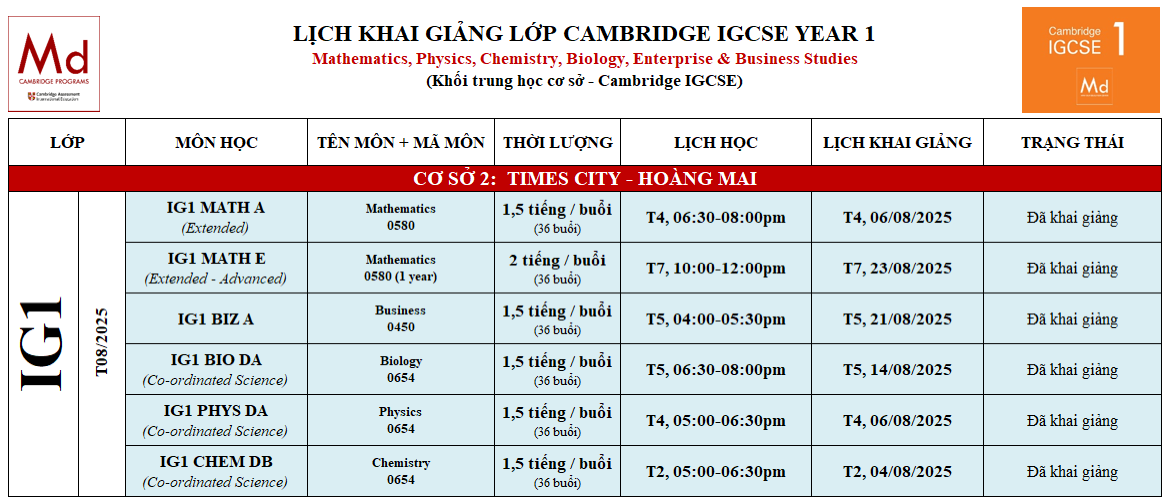 LỊCH KHAI GIẢNG CÁC LỚP CAMBRIDGE IGCSE YEAR 1 TẠI CƠ SỞ TIMES CITY (HOÀNG MAI)