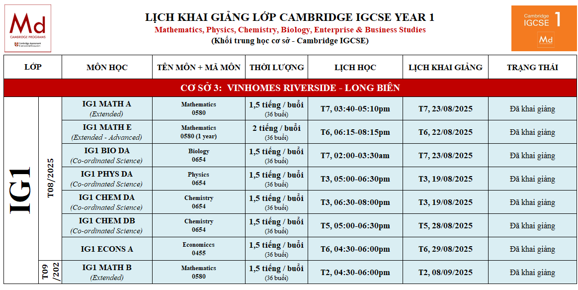 LỊCH KHAI GIẢNG CÁC LỚP CAMBRIDGE IGCSE YEAR 1 TẠI CƠ SỞ SYMPHONY (LONG BIÊN)