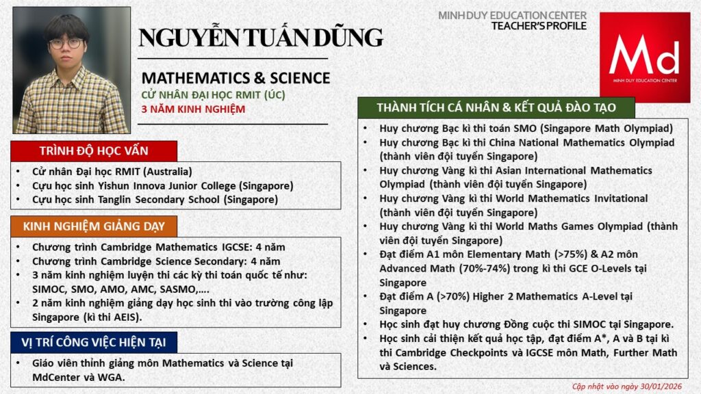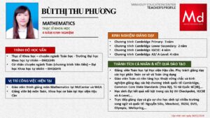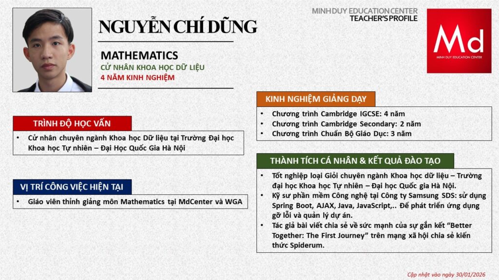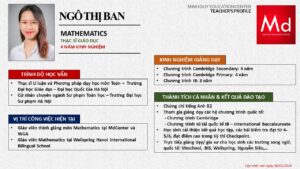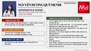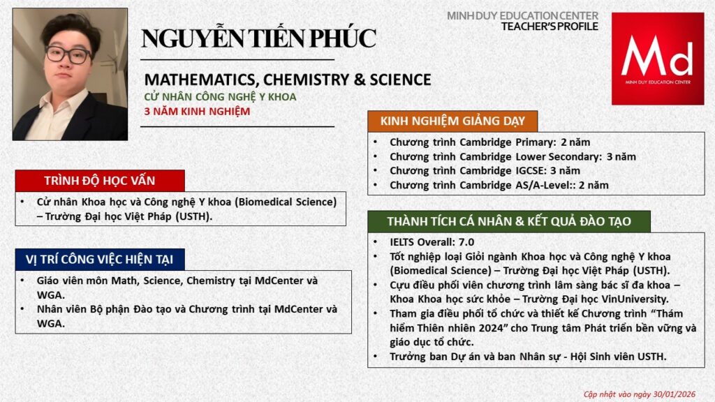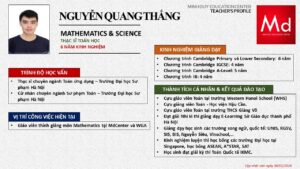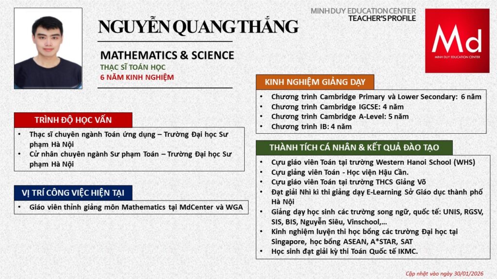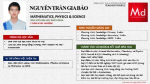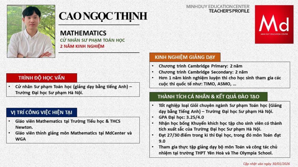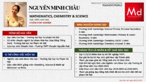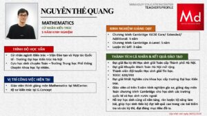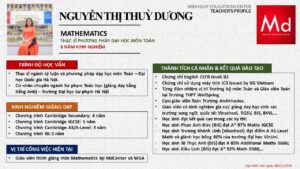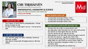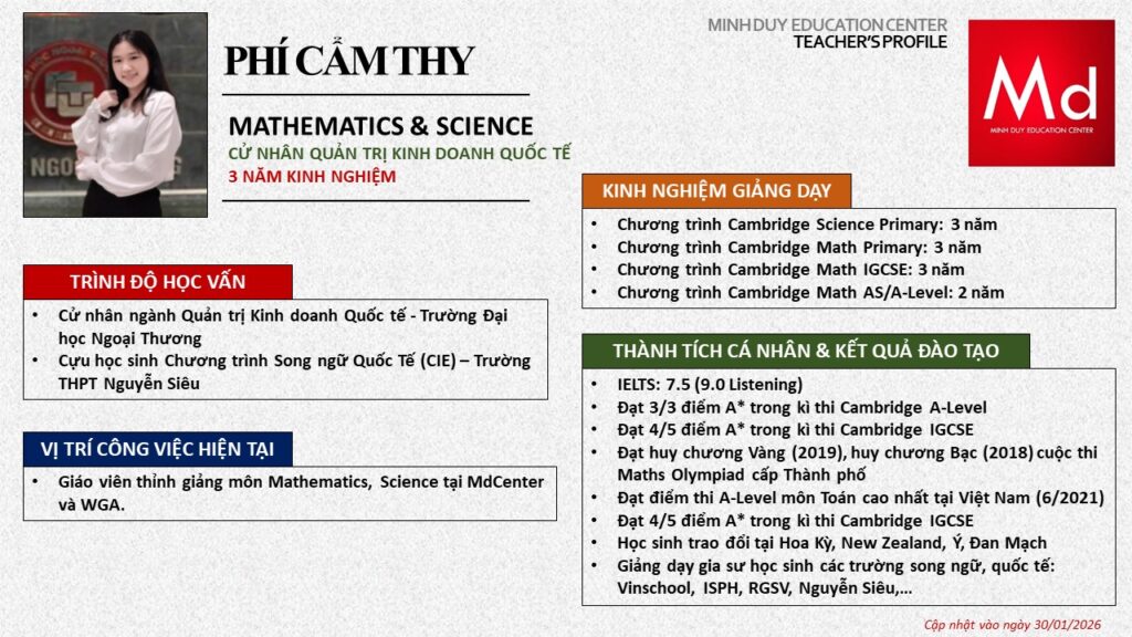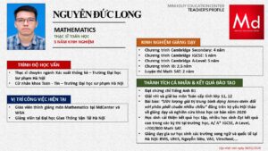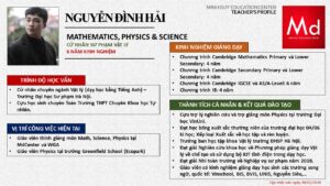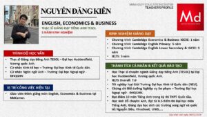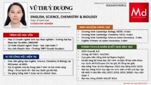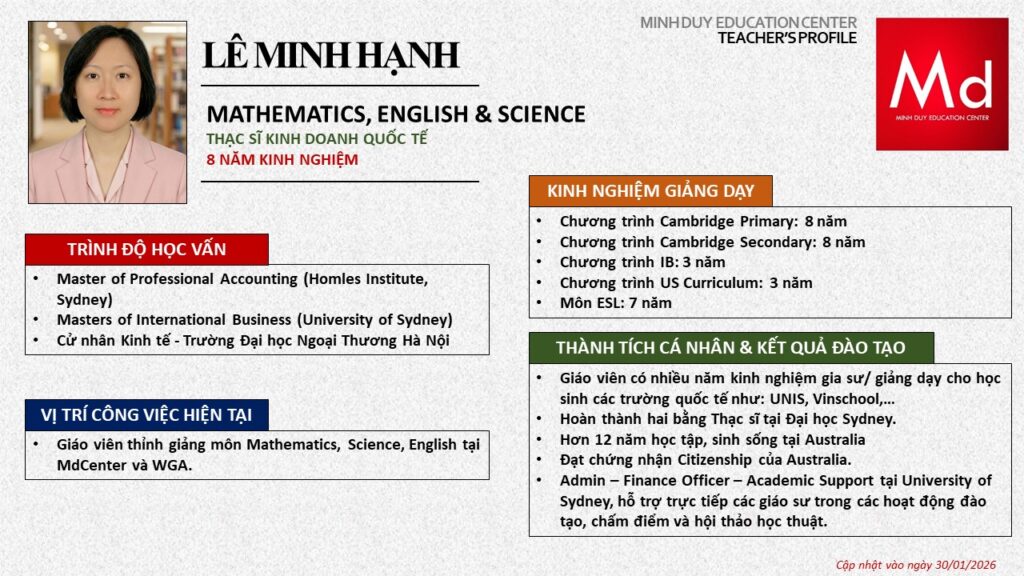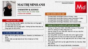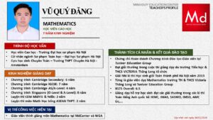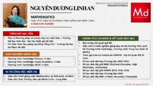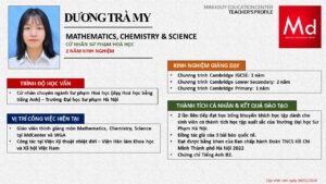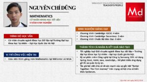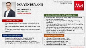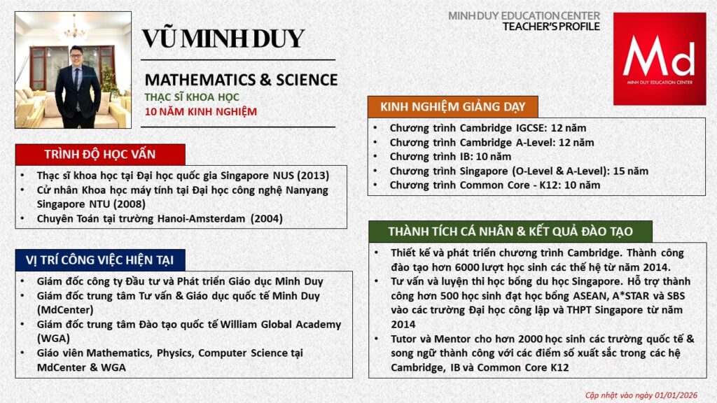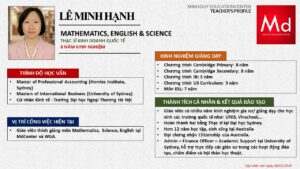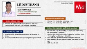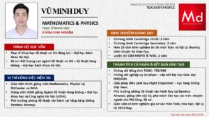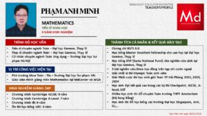 Bên cạnh đó, về chuyên môn đào tạo và giảng dạy, Minh Duycó kinh nghiệm đào tạo 15 môn học trong chương trình quốc tế Cambridge, IB và Common Core bao gồm: Mathematics, Physics, Chemistry, Biology, Science, Economics, Business, Global Perspectives, English, Accounting, Psychology, Sociology, Computer Science & Media Studies.