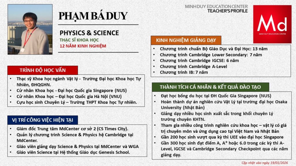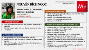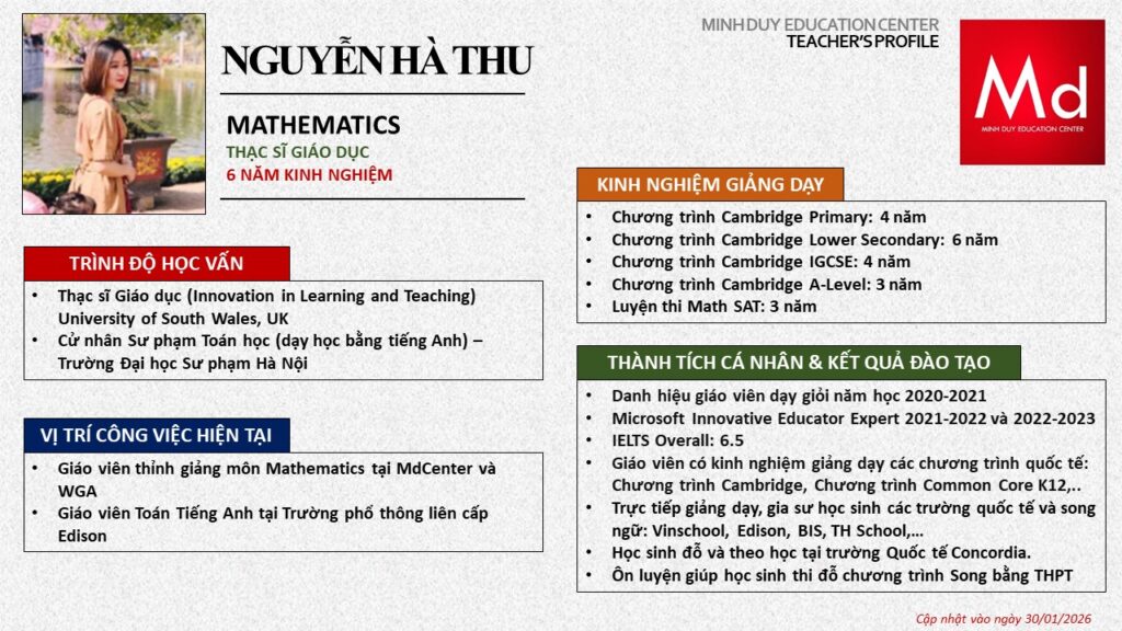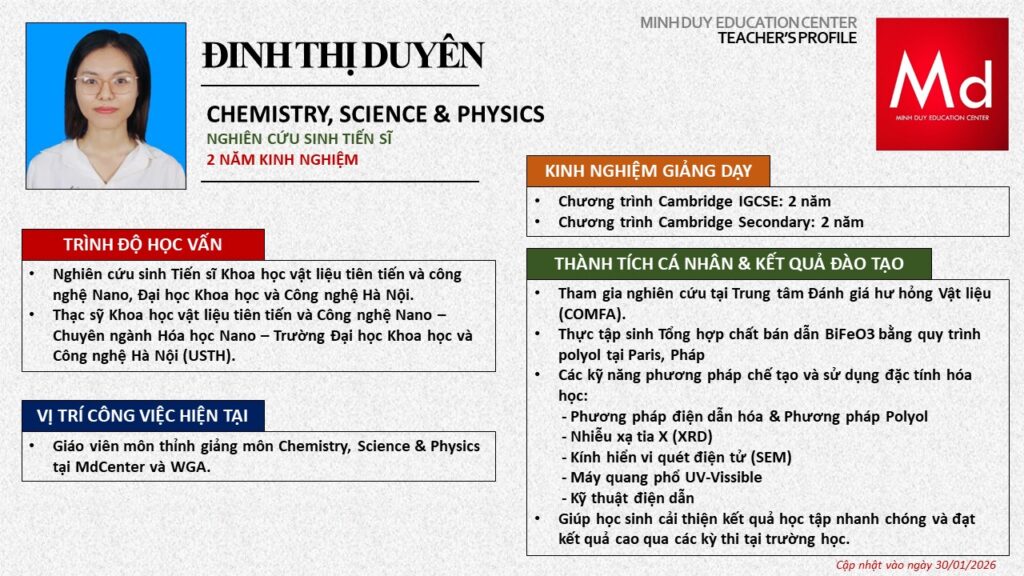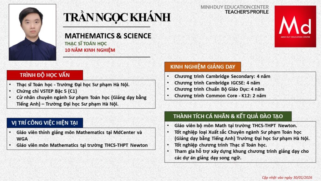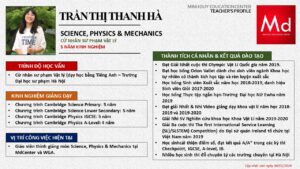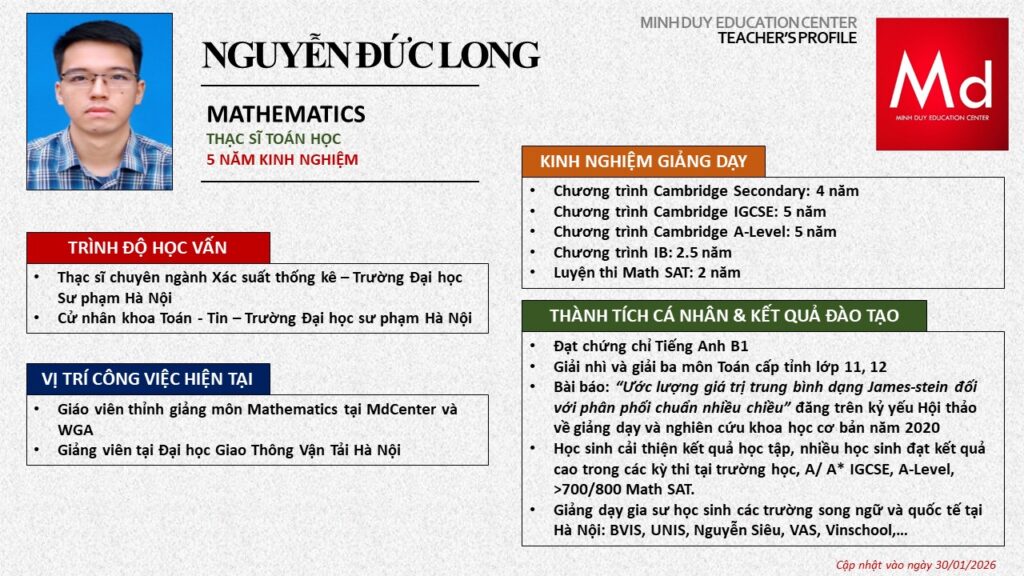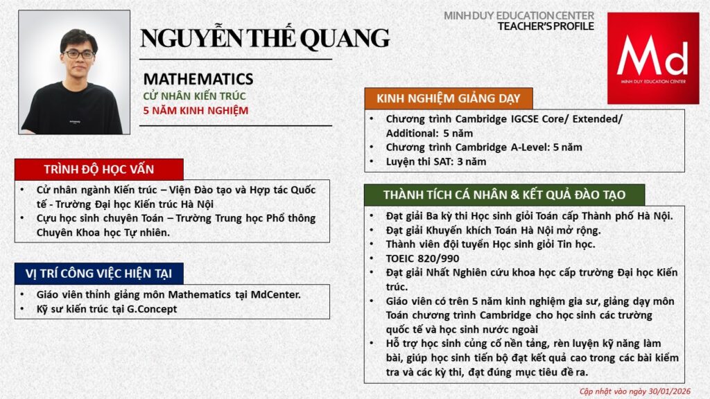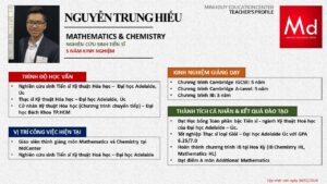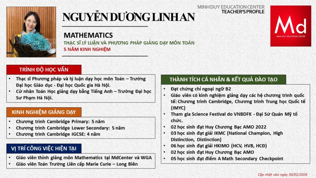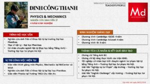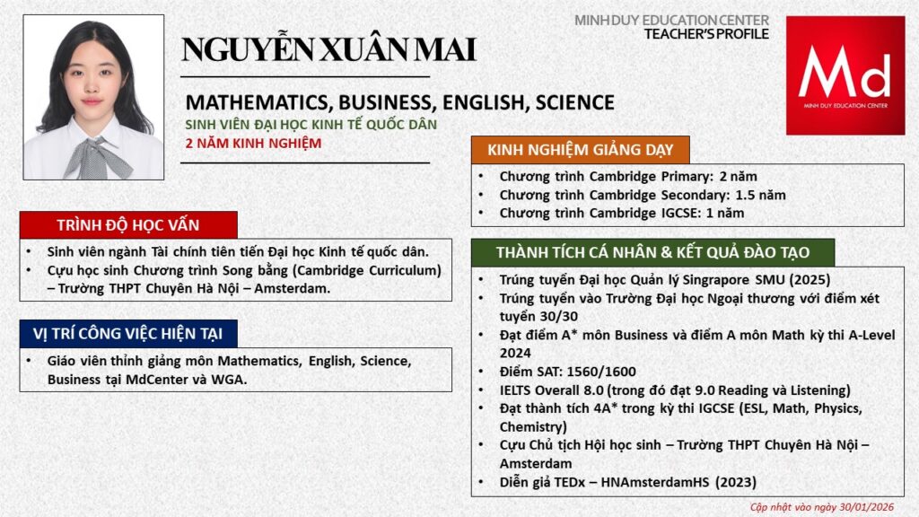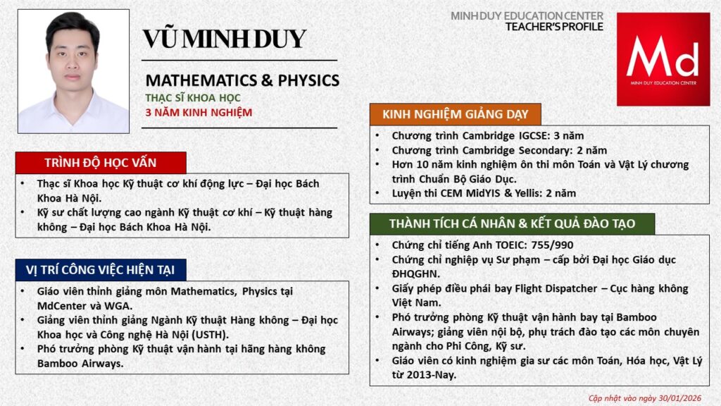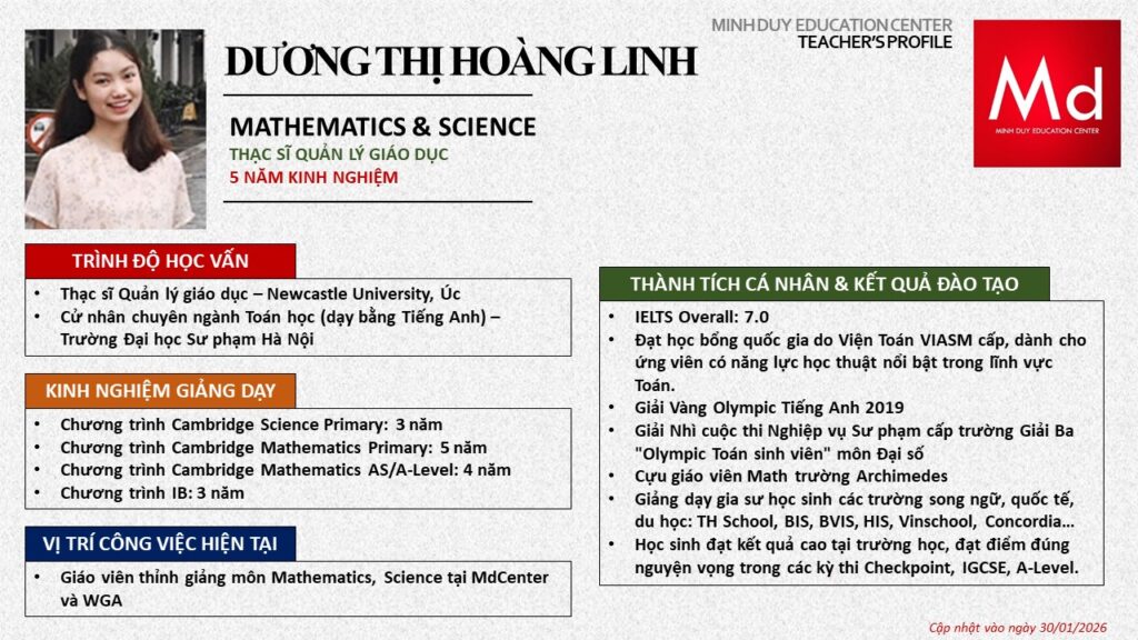 Bên cạnh đó, về chuyên môn đào tạo và giảng dạy, Minh Duycó kinh nghiệm đào tạo 15 môn học trong chương trình quốc tế Cambridge, IB và Common Core bao gồm: Mathematics, Physics, Chemistry, Biology, Science, Economics, Business, Global Perspectives, English, Accounting, Psychology, Sociology, Computer Science & Media Studies.