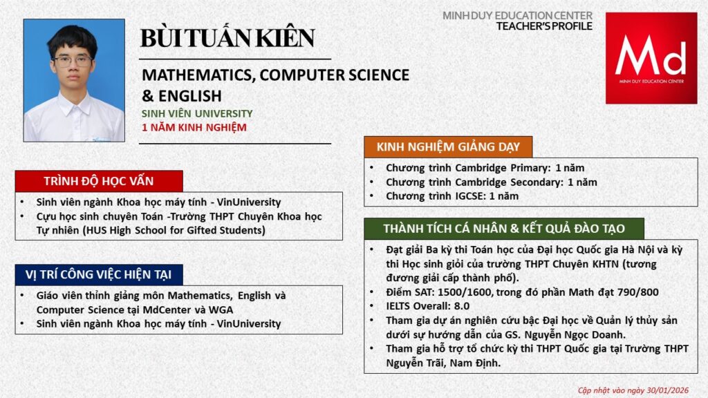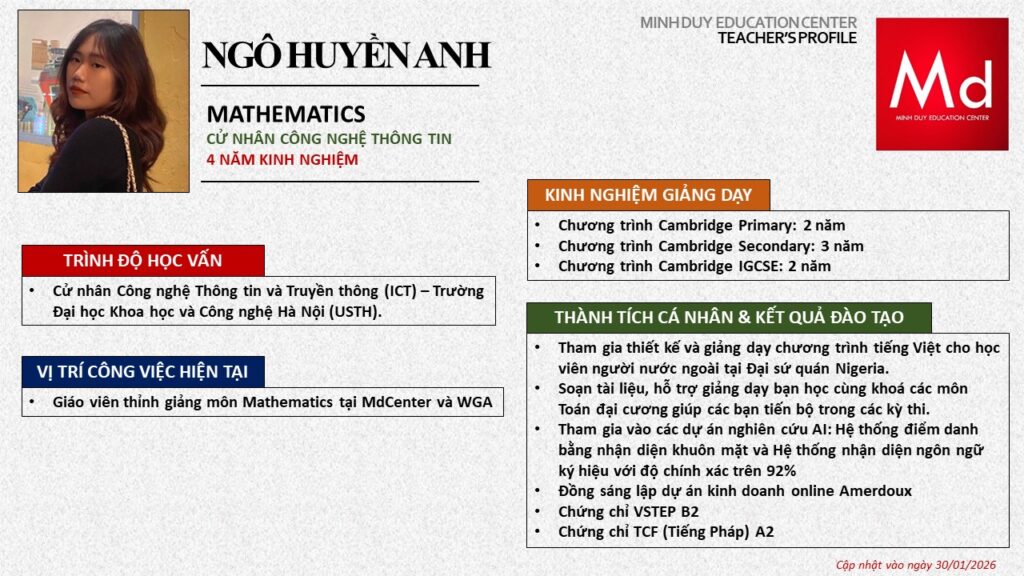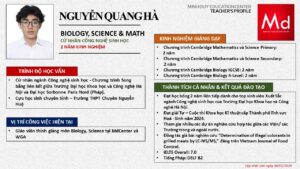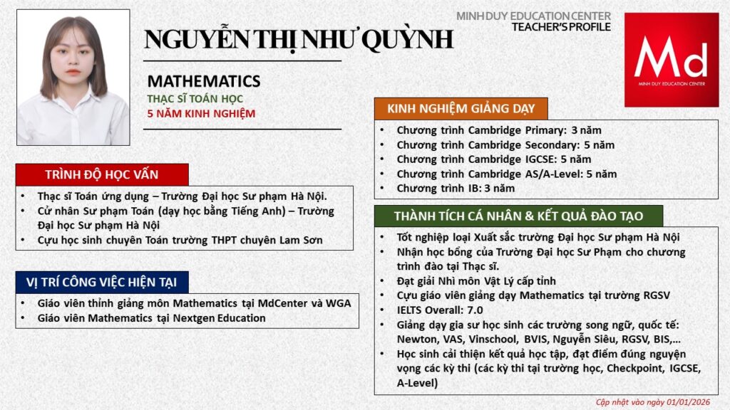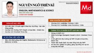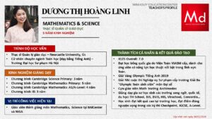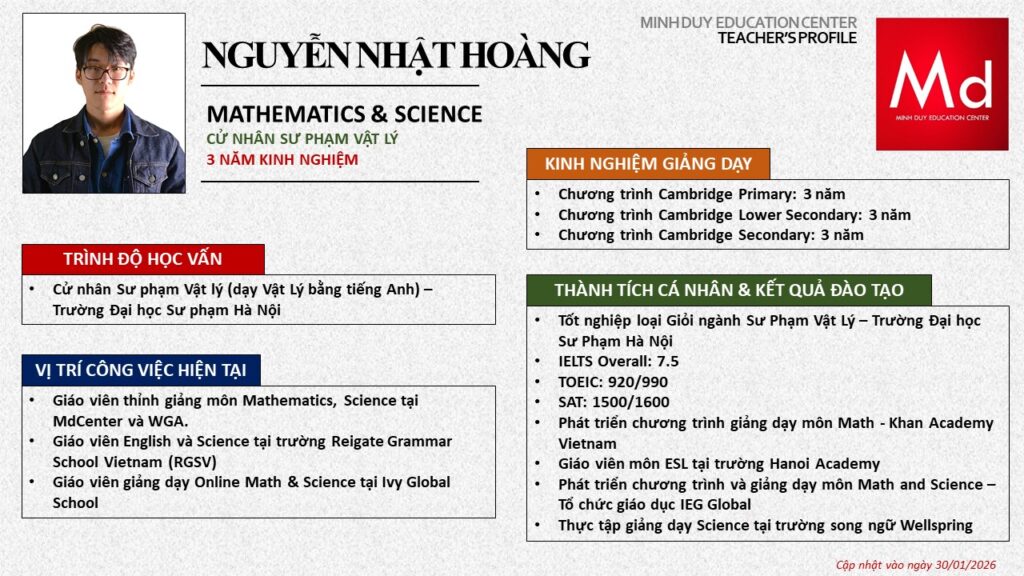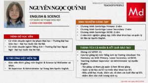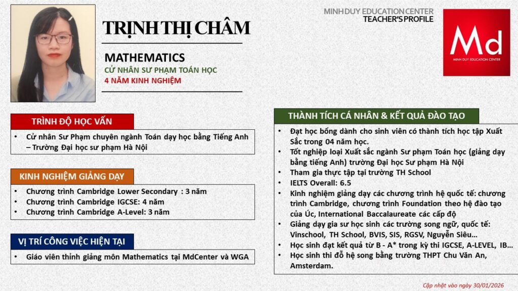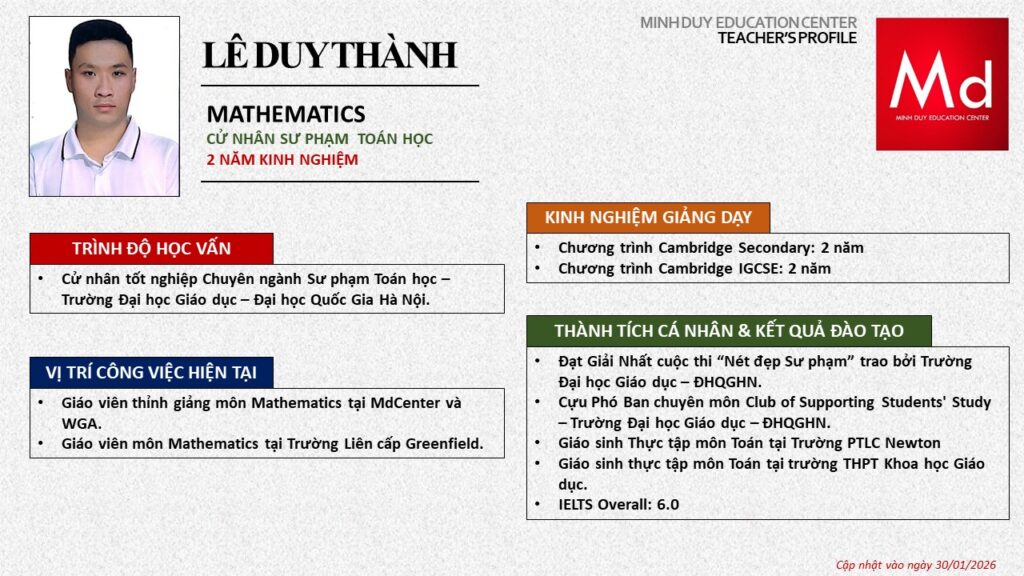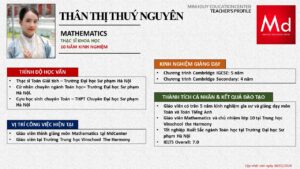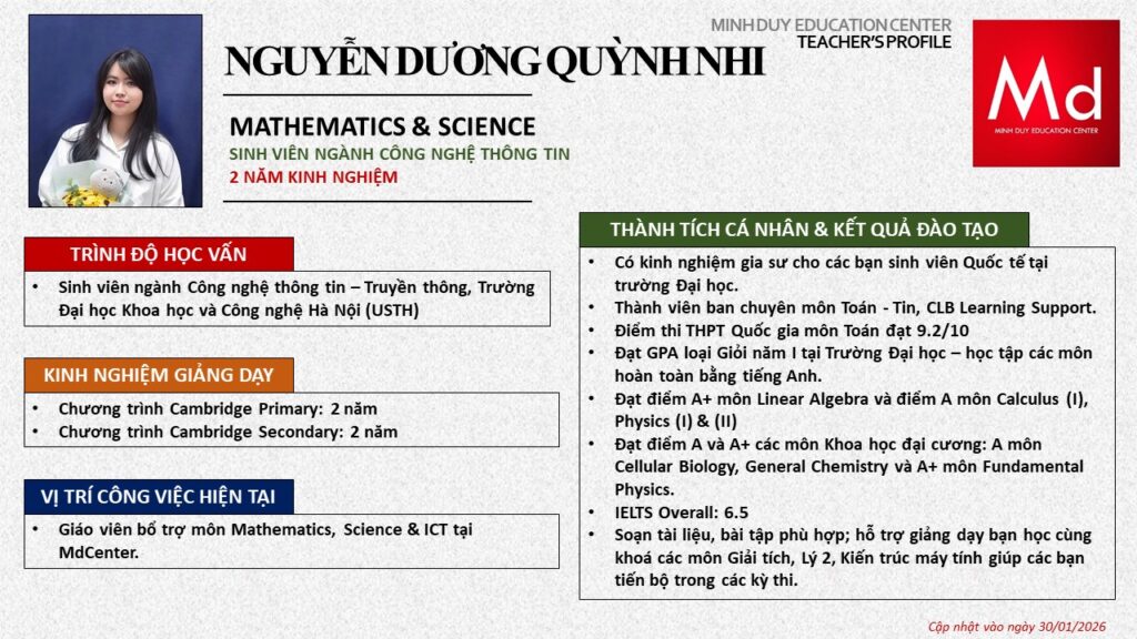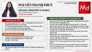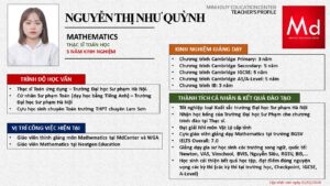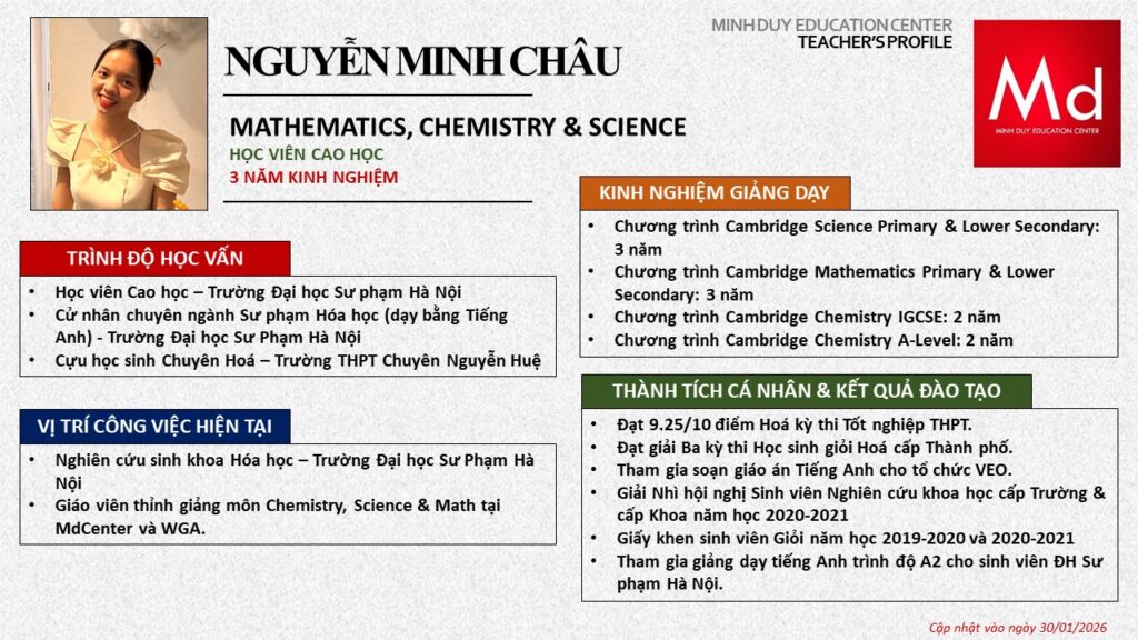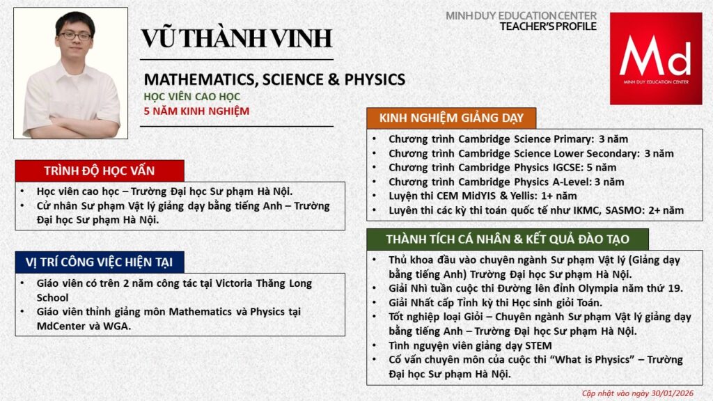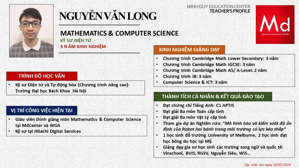Bên cạnh đó, về chuyên môn đào tạo và giảng dạy, Minh Duycó kinh nghiệm đào tạo 15 môn học trong chương trình quốc tế Cambridge, IB và Common Core bao gồm: Mathematics, Physics, Chemistry, Biology, Science, Economics, Business, Global Perspectives, English, Accounting, Psychology, Sociology, Computer Science & Media Studies.