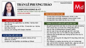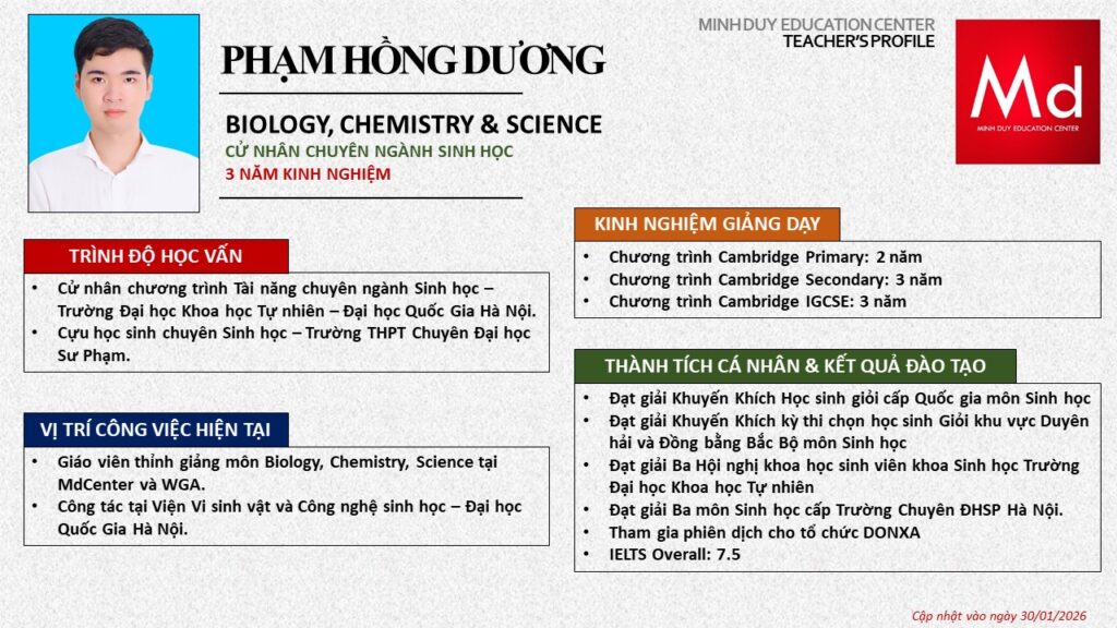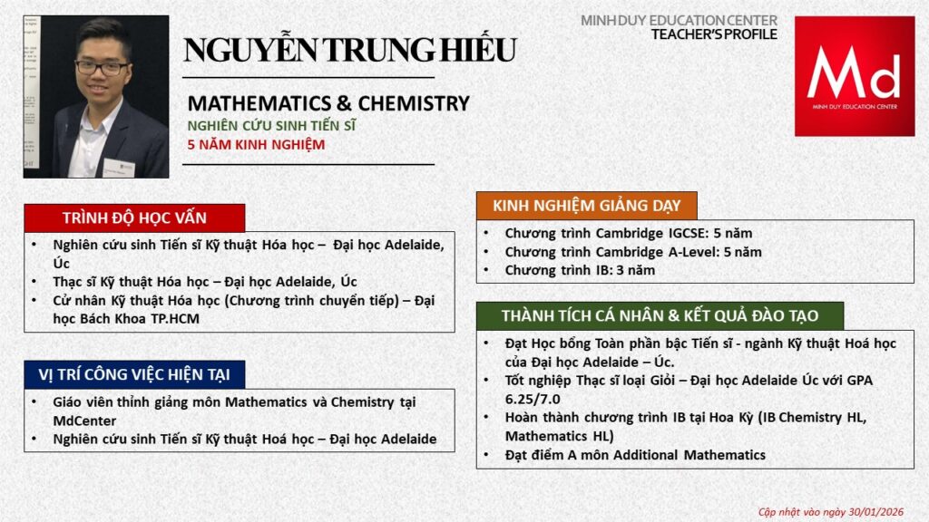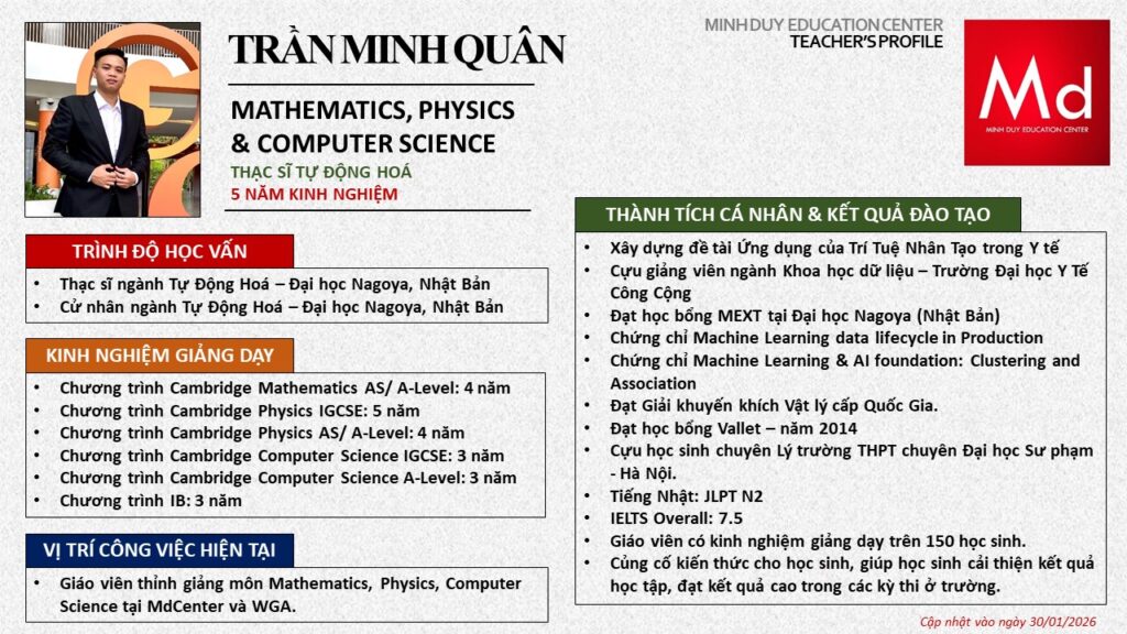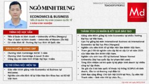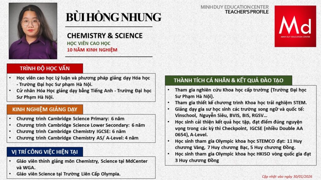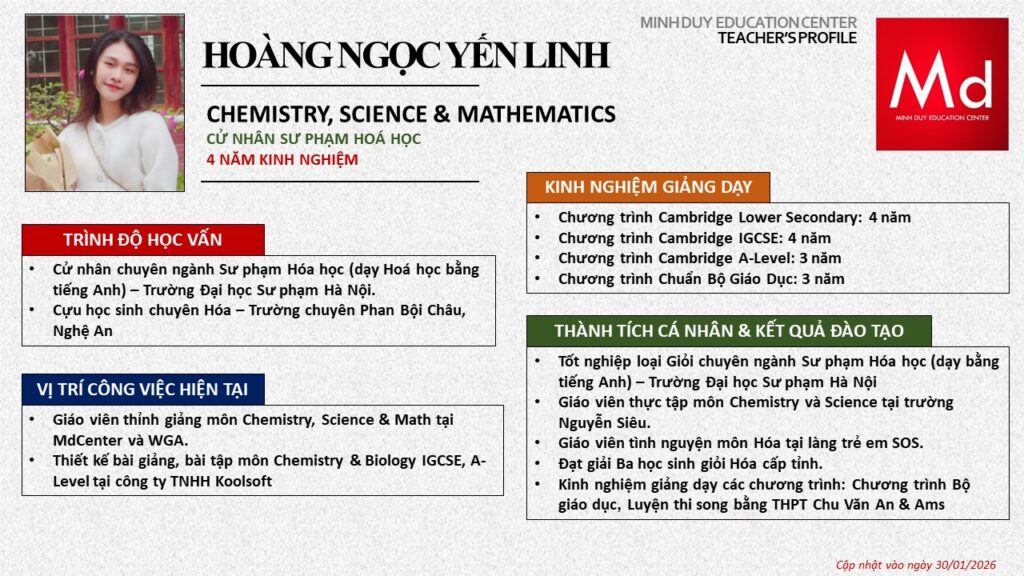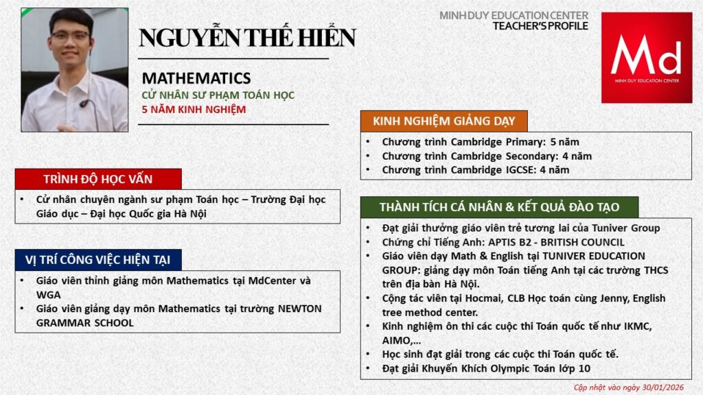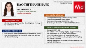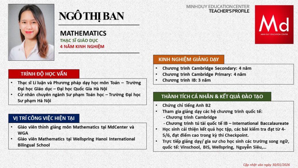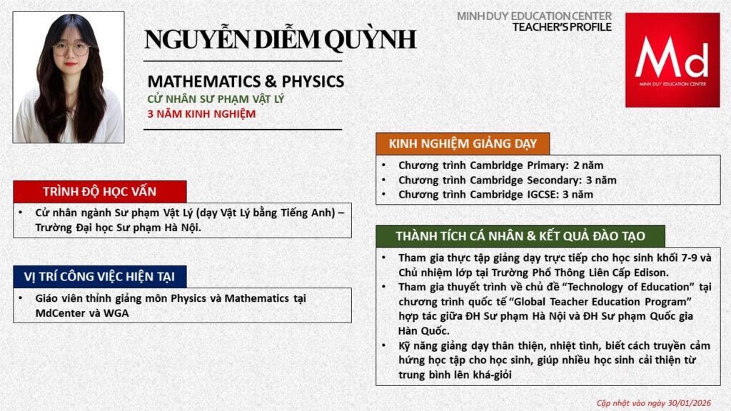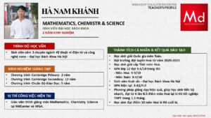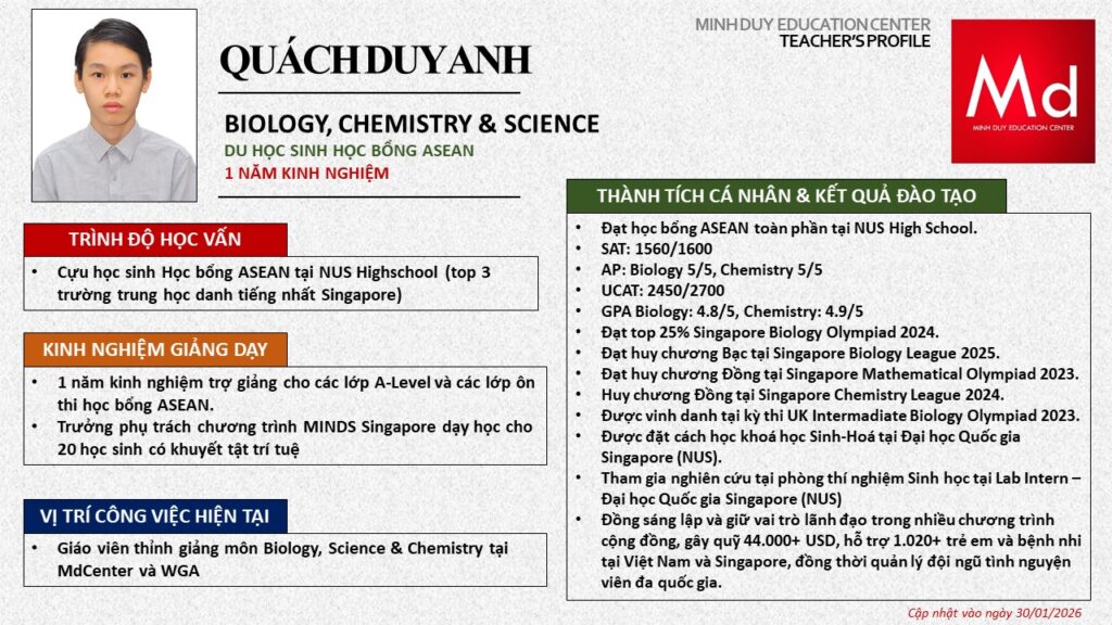 Bên cạnh đó, về chuyên môn đào tạo và giảng dạy, Minh Duycó kinh nghiệm đào tạo 15 môn học trong chương trình quốc tế Cambridge, IB và Common Core bao gồm: Mathematics, Physics, Chemistry, Biology, Science, Economics, Business, Global Perspectives, English, Accounting, Psychology, Sociology, Computer Science & Media Studies.