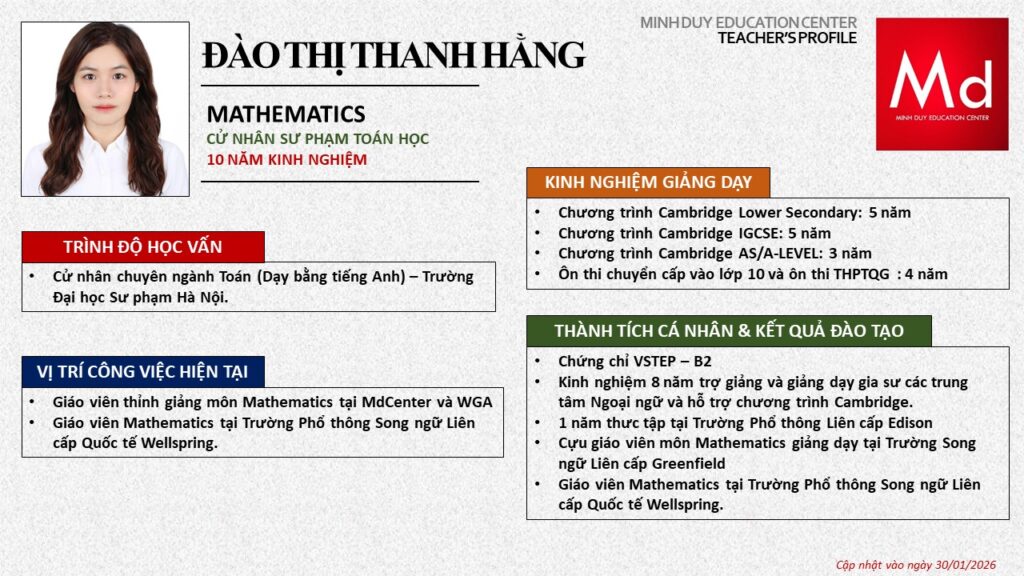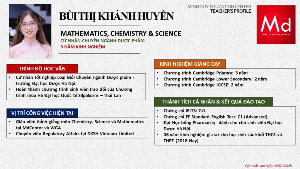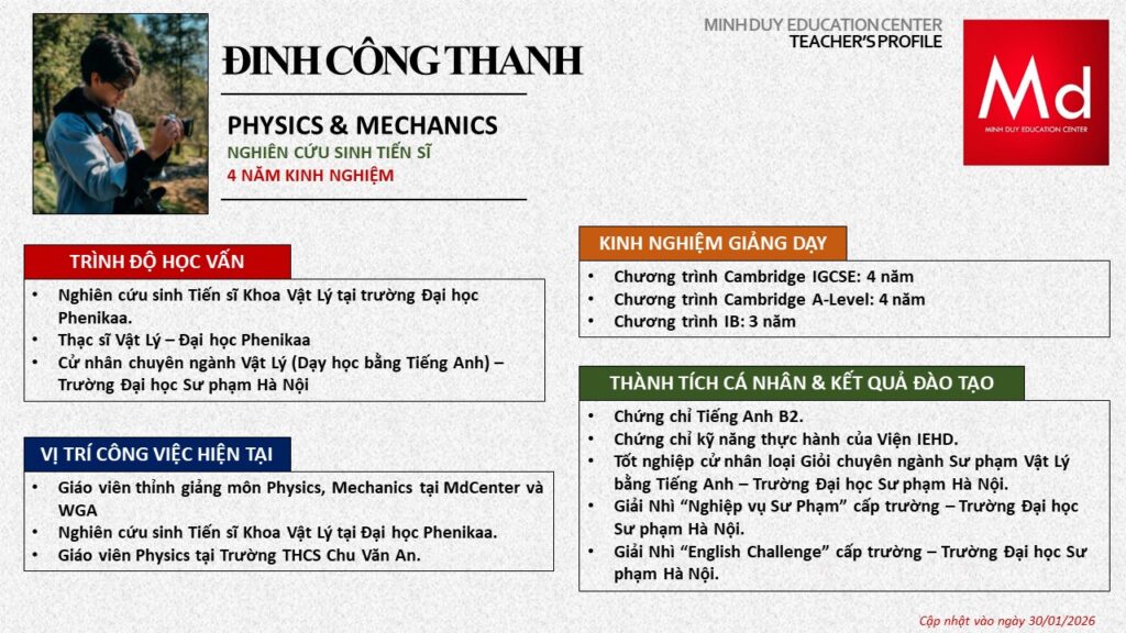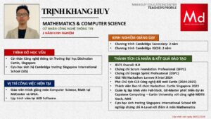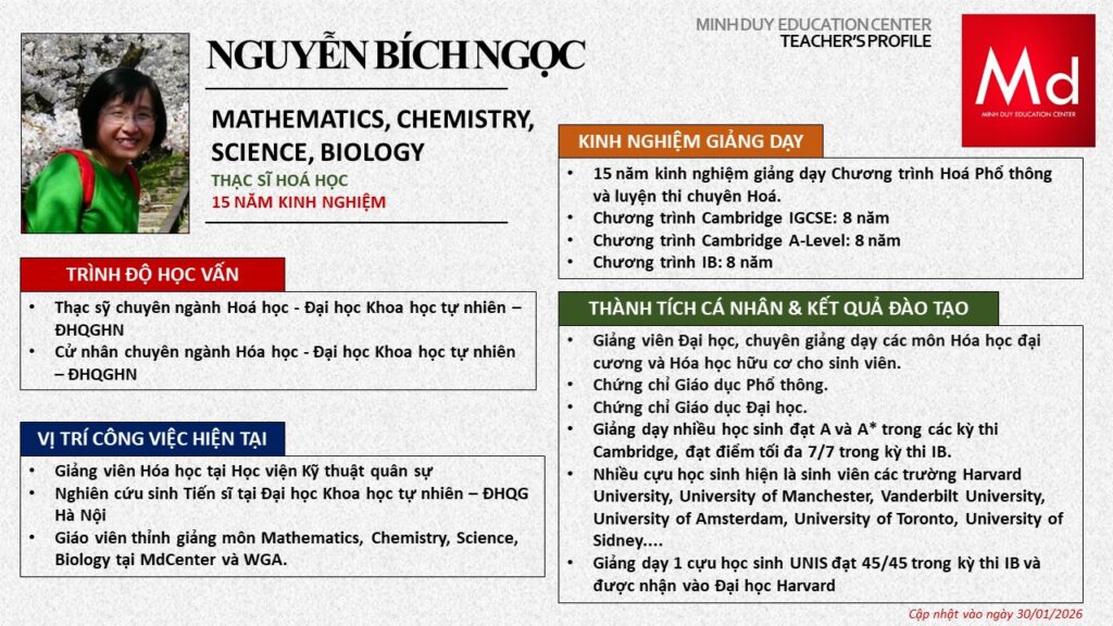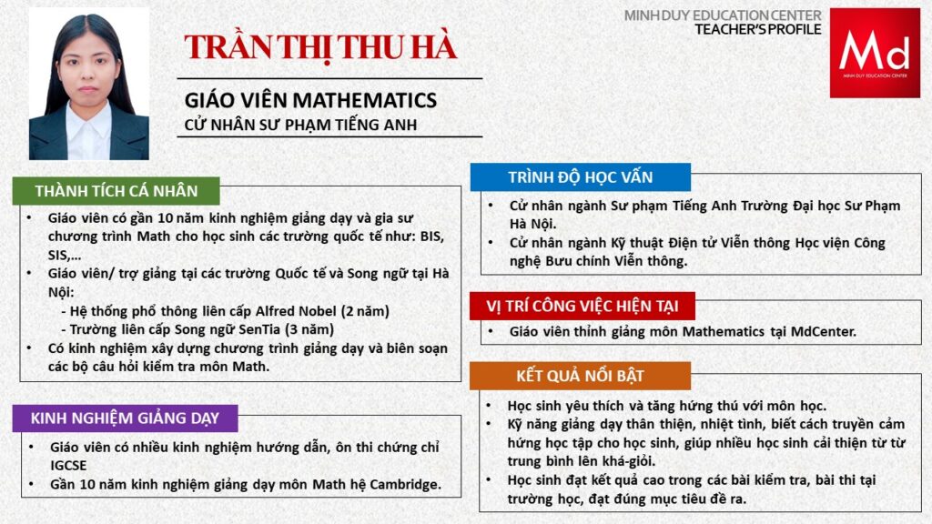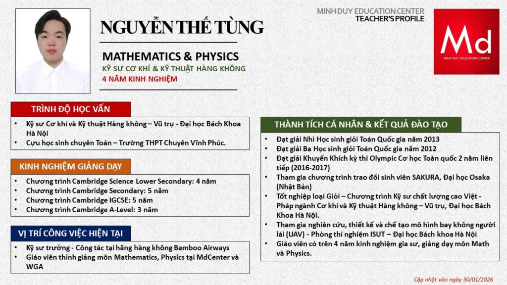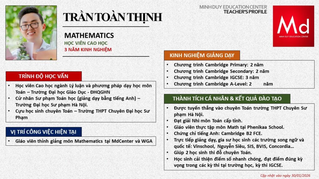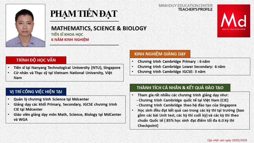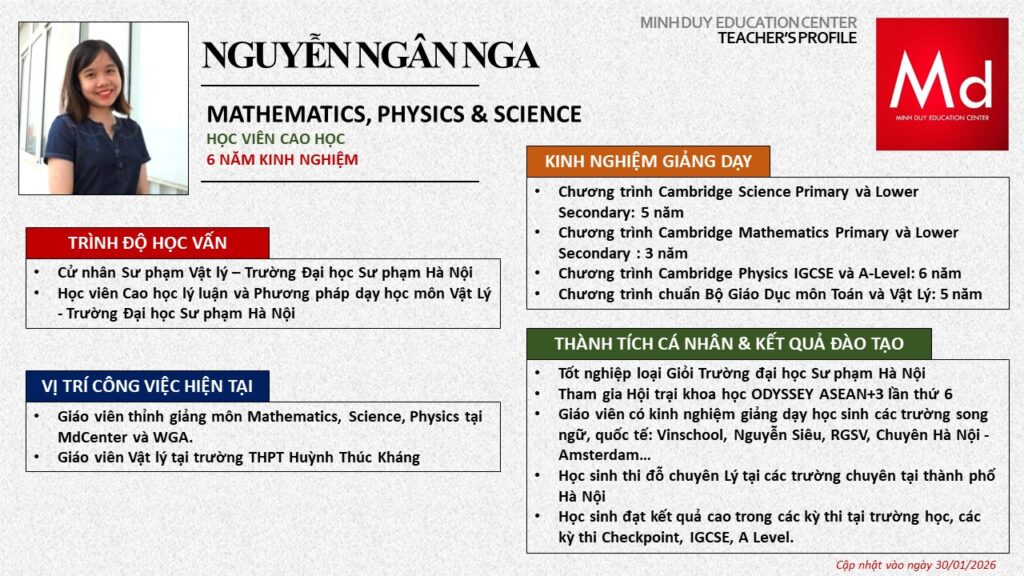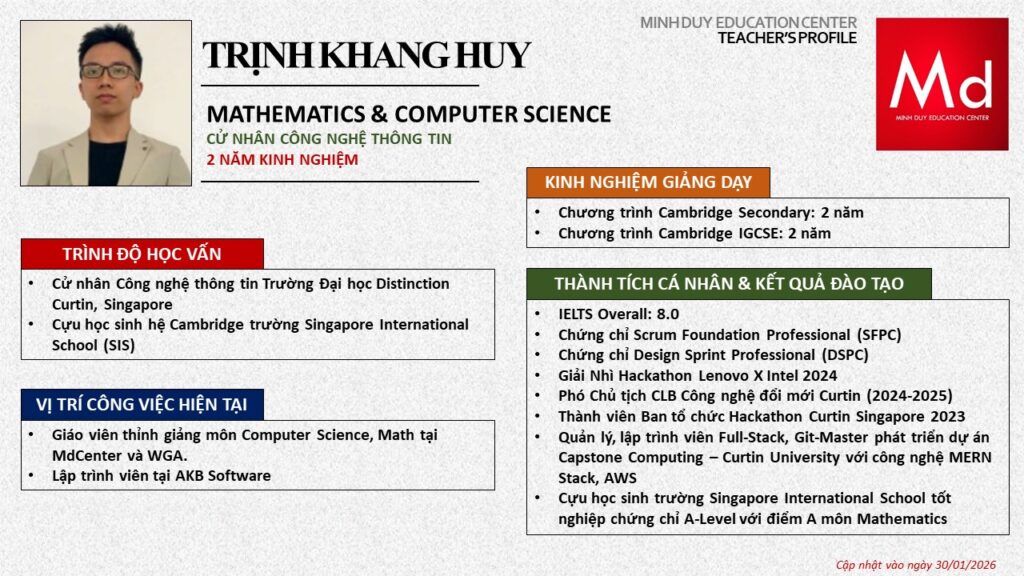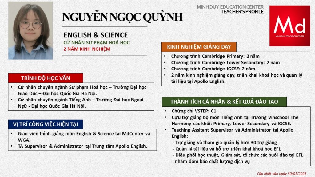 Bên cạnh đó, về chuyên môn đào tạo và giảng dạy, Minh Duycó kinh nghiệm đào tạo 15 môn học trong chương trình quốc tế Cambridge, IB và Common Core bao gồm: Mathematics, Physics, Chemistry, Biology, Science, Economics, Business, Global Perspectives, English, Accounting, Psychology, Sociology, Computer Science & Media Studies.