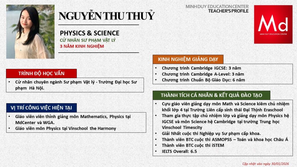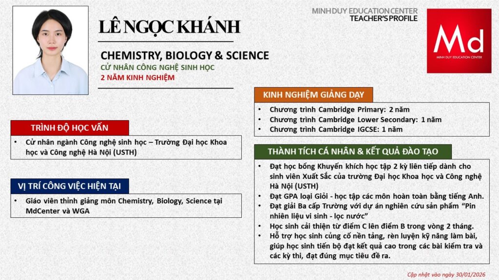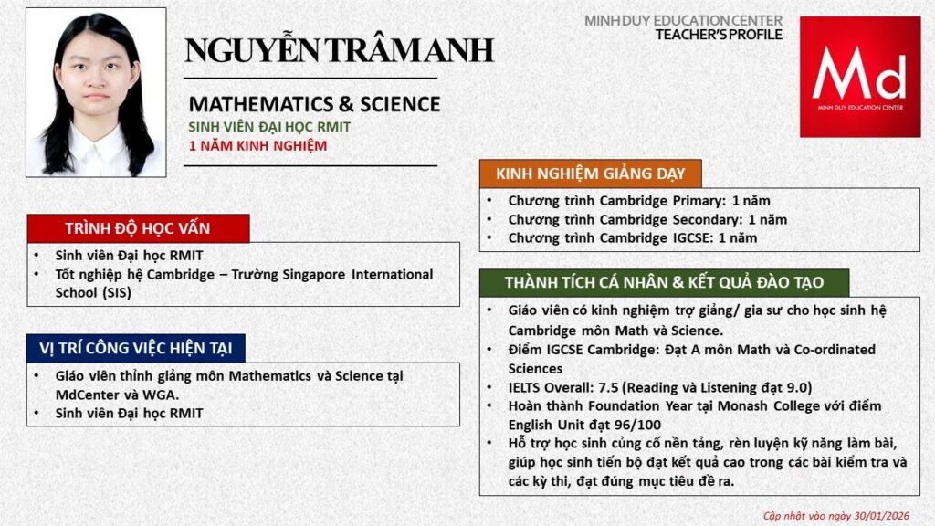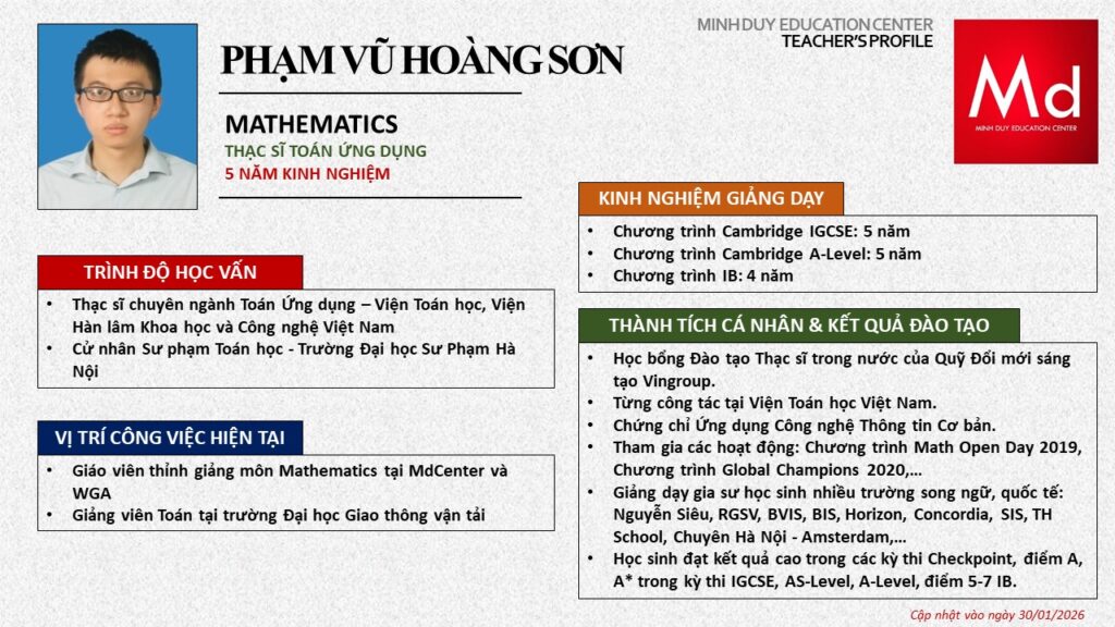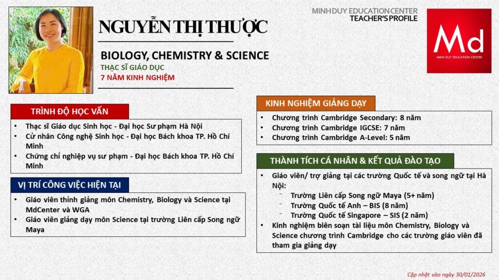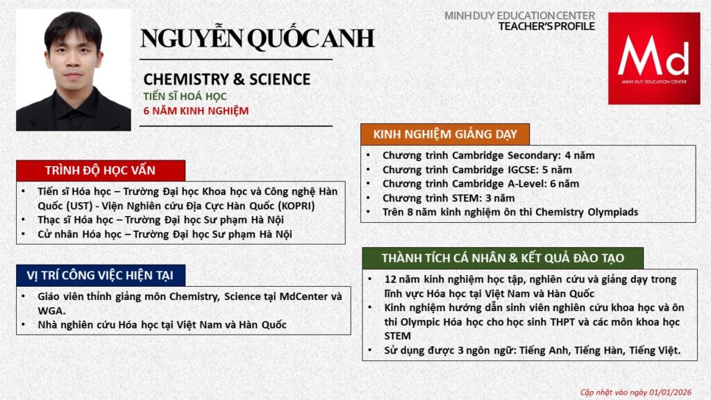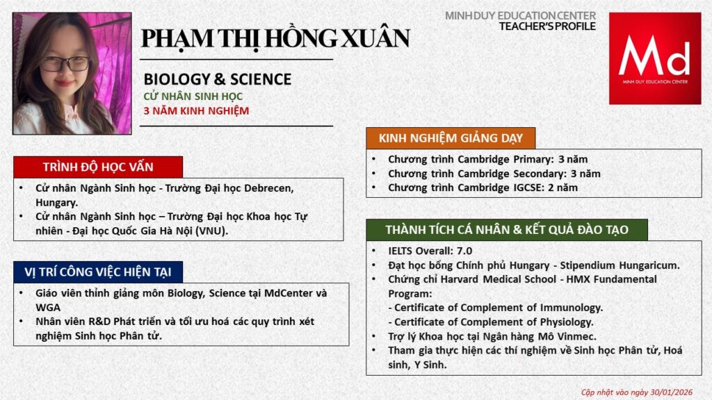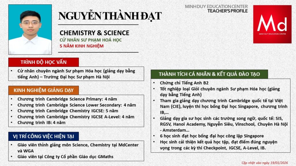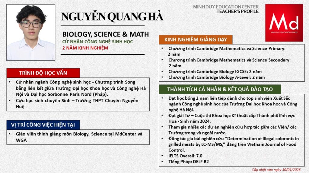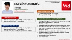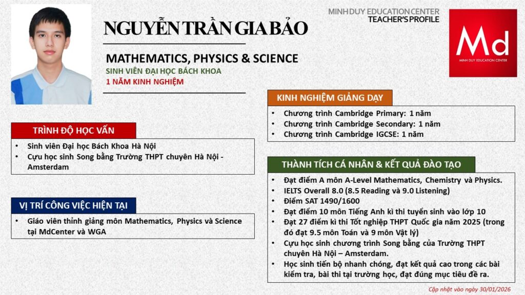 Bên cạnh đó, về chuyên môn đào tạo và giảng dạy, Minh Duycó kinh nghiệm đào tạo 15 môn học trong chương trình quốc tế Cambridge, IB và Common Core bao gồm: Mathematics, Physics, Chemistry, Biology, Science, Economics, Business, Global Perspectives, English, Accounting, Psychology, Sociology, Computer Science & Media Studies.