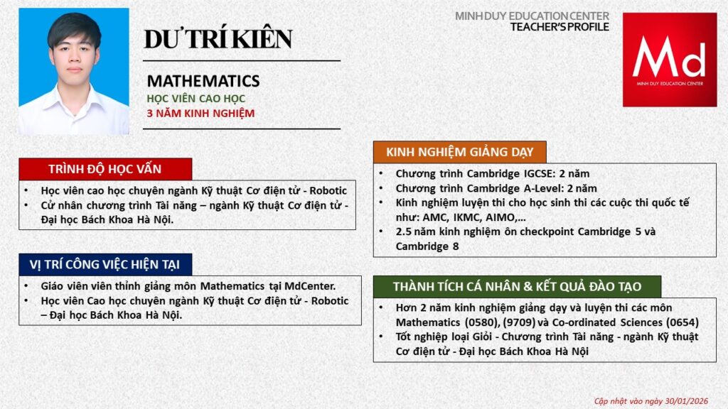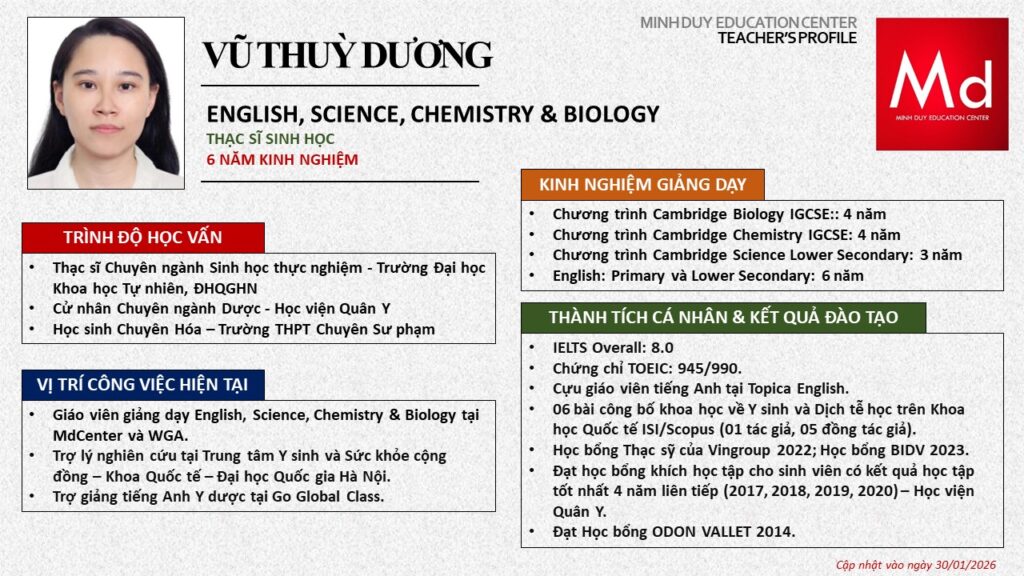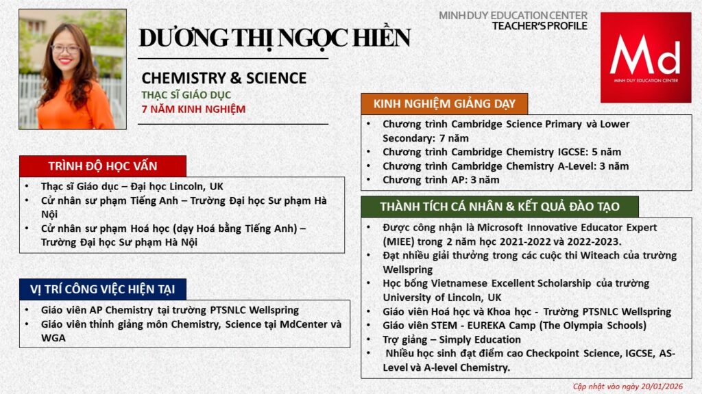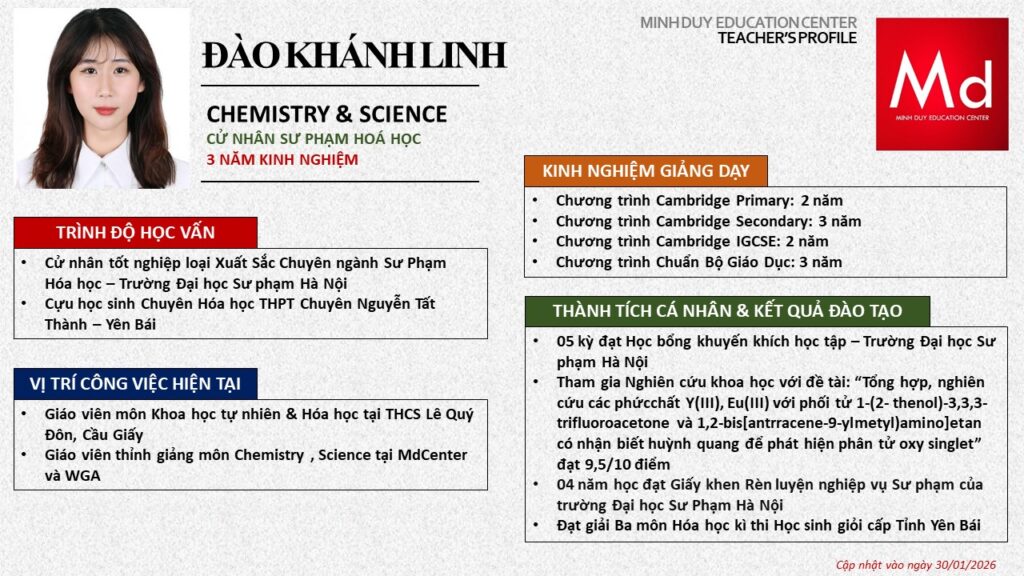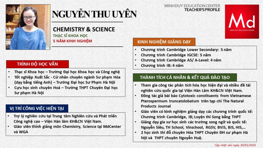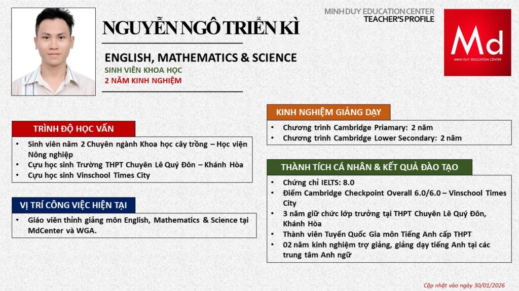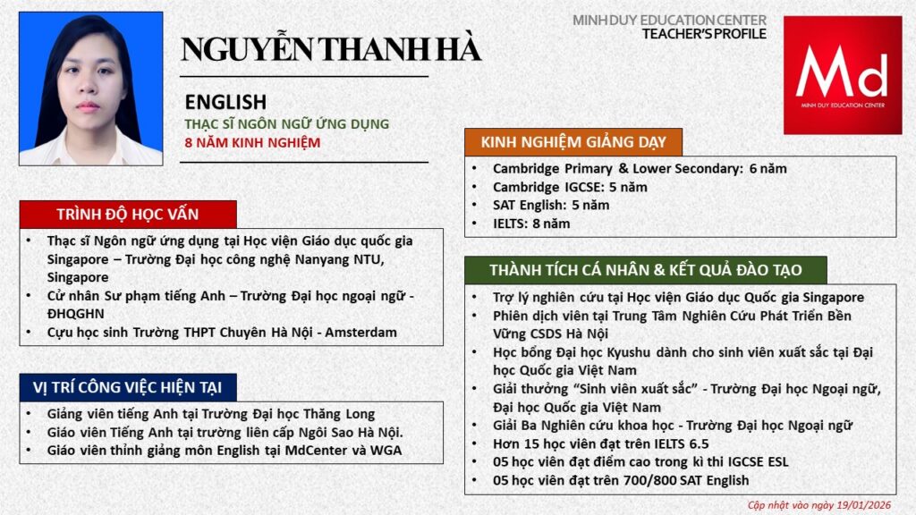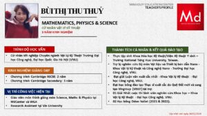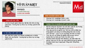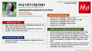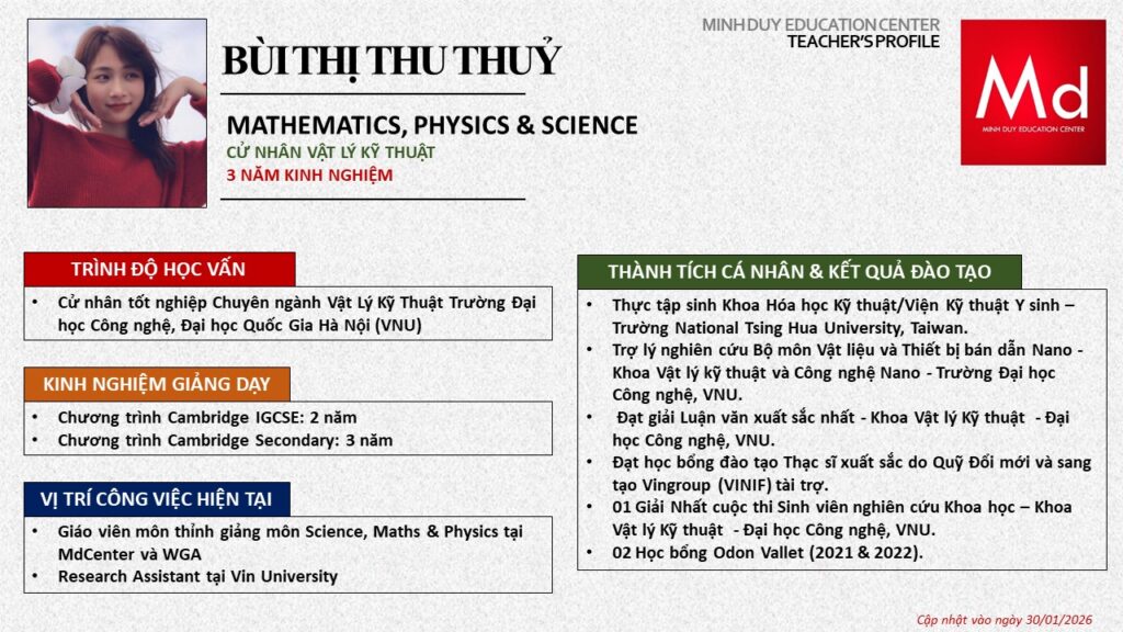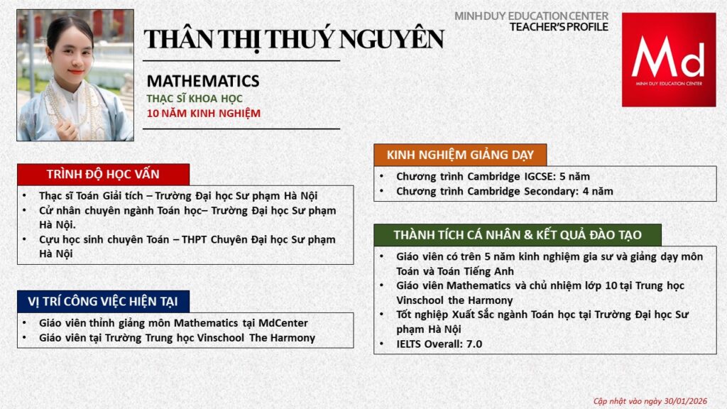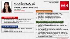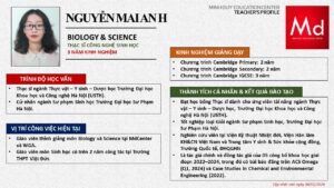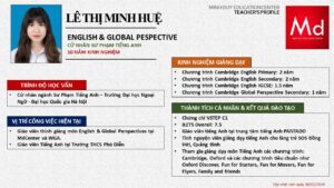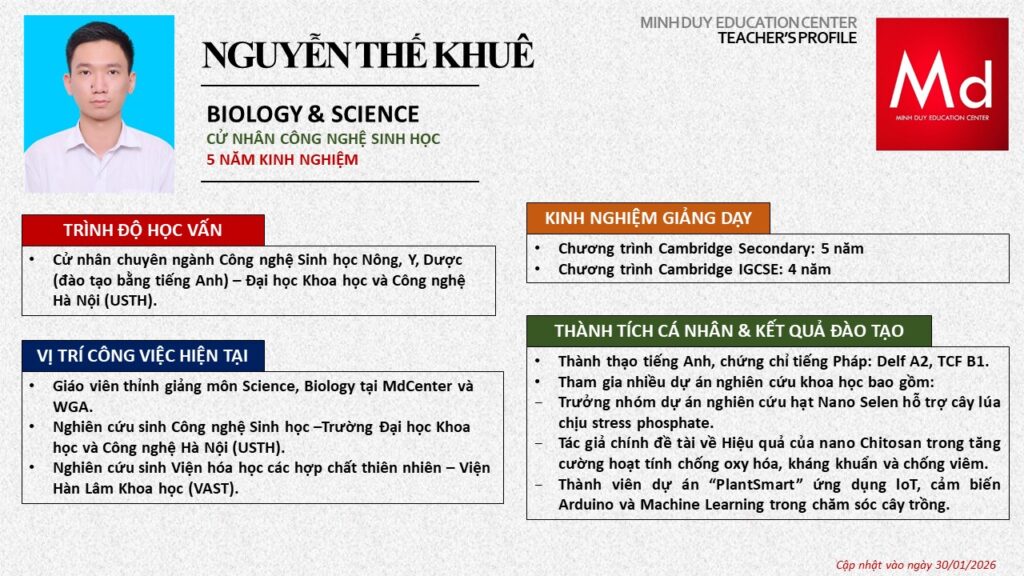 Bên cạnh đó, về chuyên môn đào tạo và giảng dạy, Minh Duycó kinh nghiệm đào tạo 15 môn học trong chương trình quốc tế Cambridge, IB và Common Core bao gồm: Mathematics, Physics, Chemistry, Biology, Science, Economics, Business, Global Perspectives, English, Accounting, Psychology, Sociology, Computer Science & Media Studies.