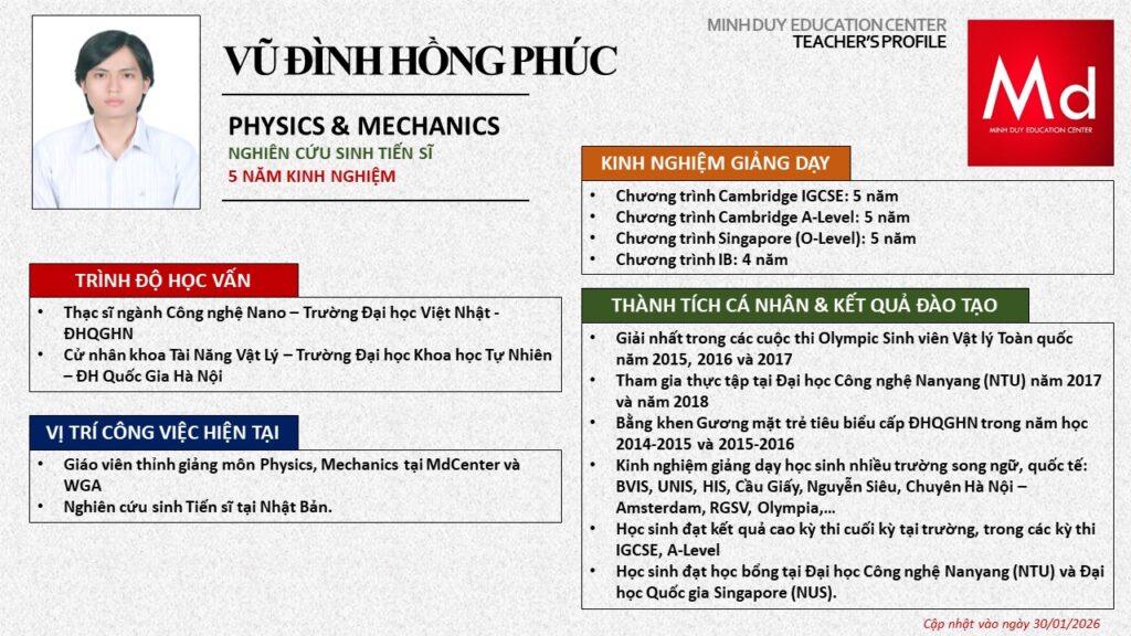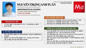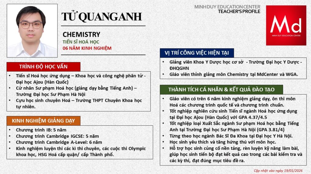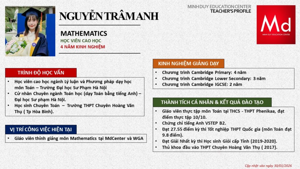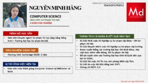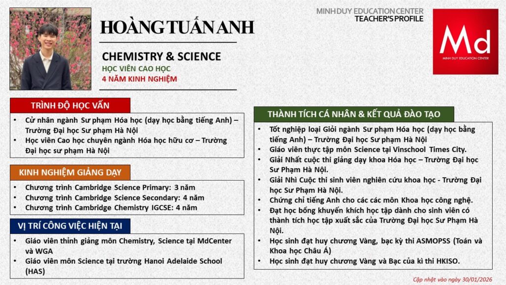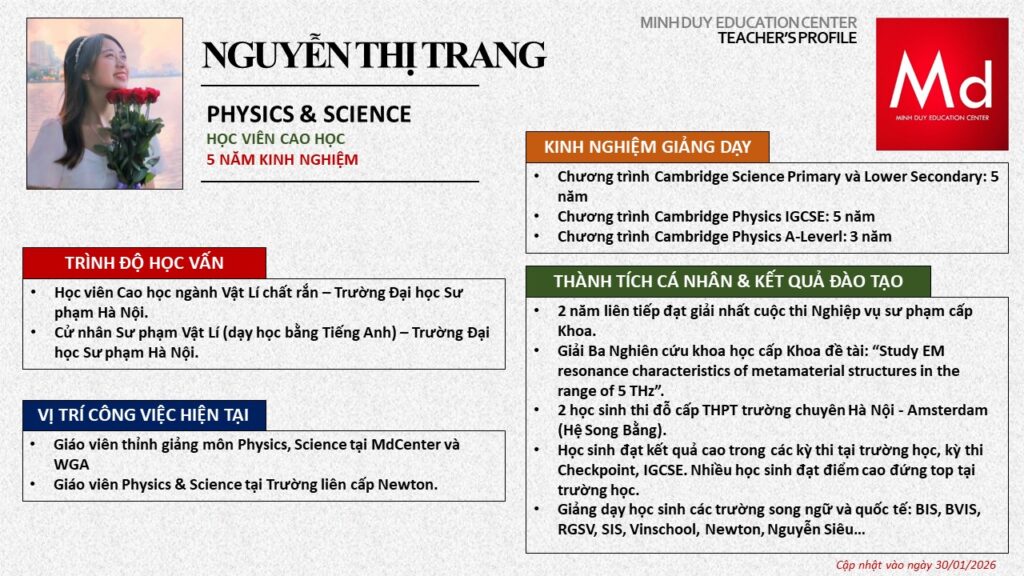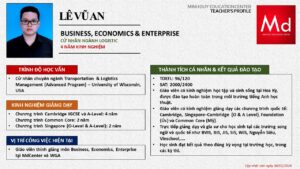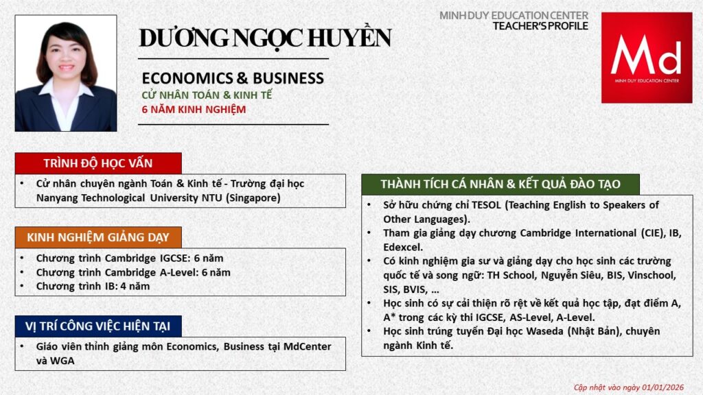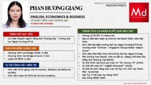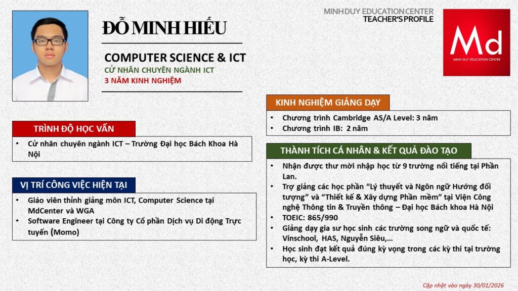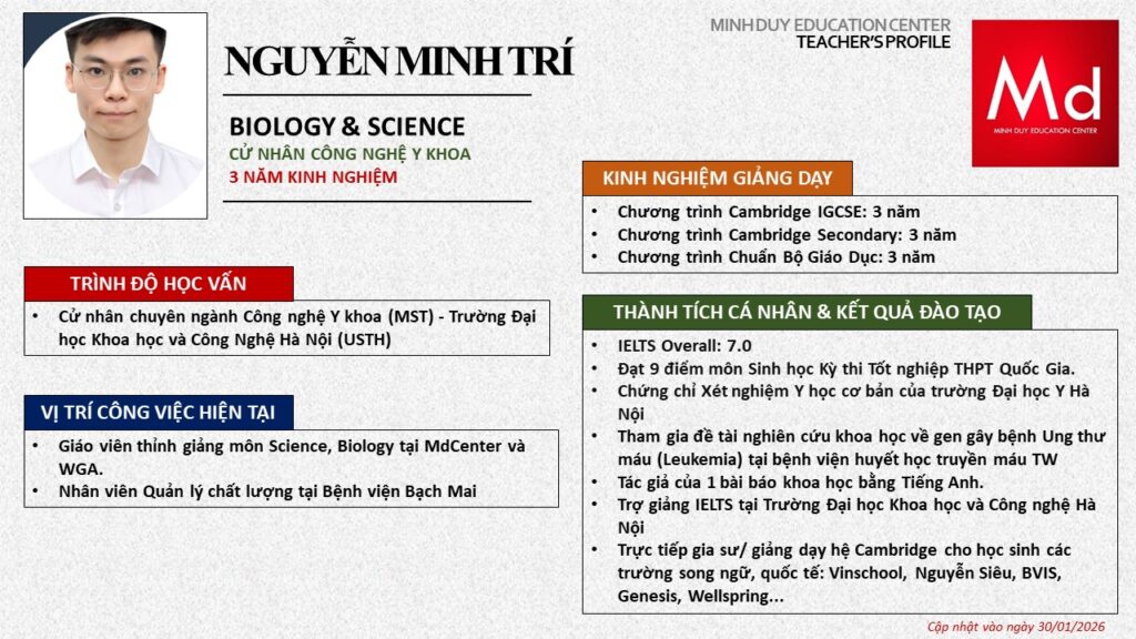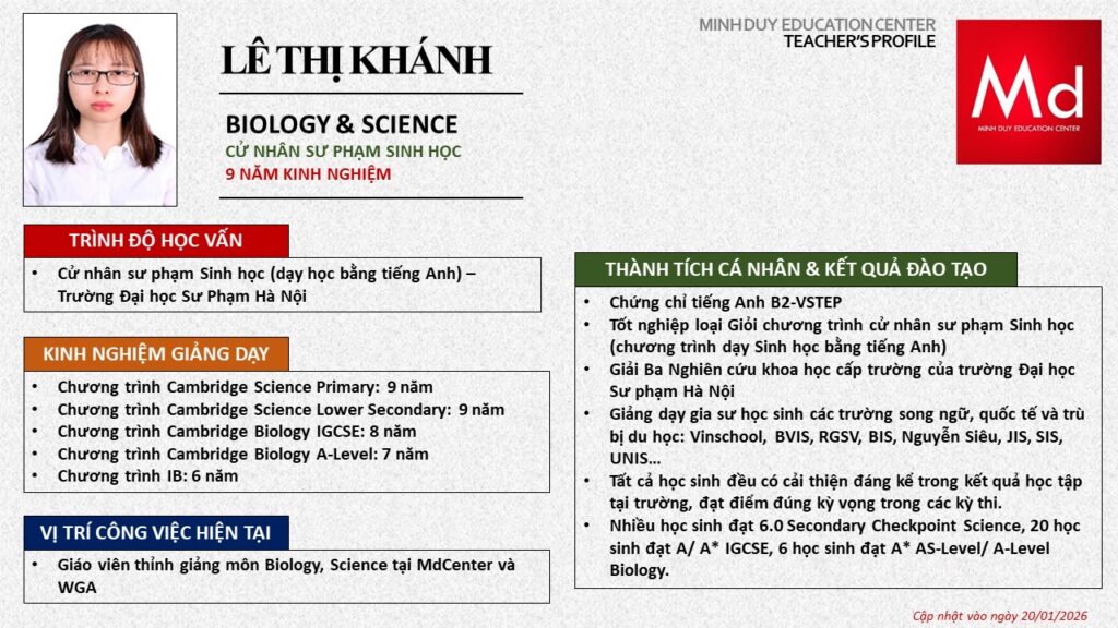 Bên cạnh đó, về chuyên môn đào tạo và giảng dạy, Minh Duycó kinh nghiệm đào tạo 15 môn học trong chương trình quốc tế Cambridge, IB và Common Core bao gồm: Mathematics, Physics, Chemistry, Biology, Science, Economics, Business, Global Perspectives, English, Accounting, Psychology, Sociology, Computer Science & Media Studies.