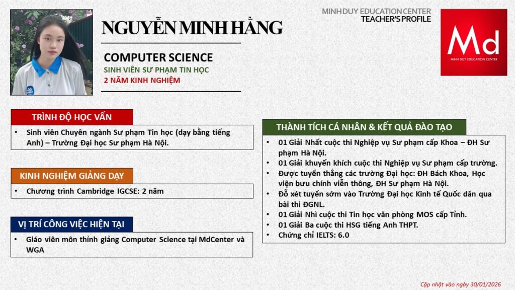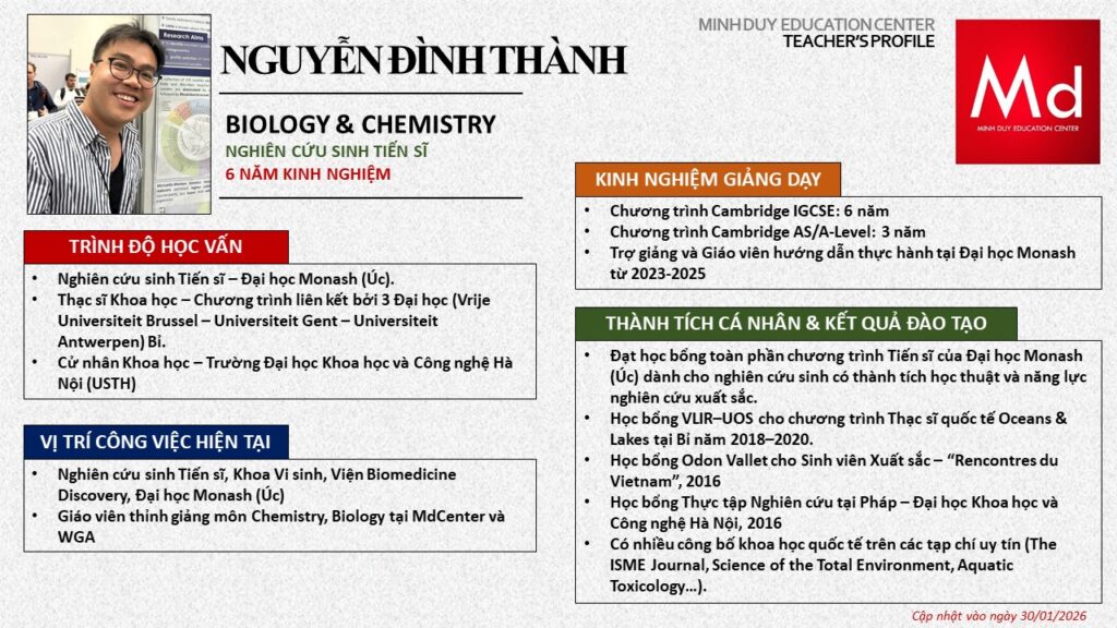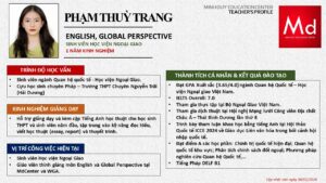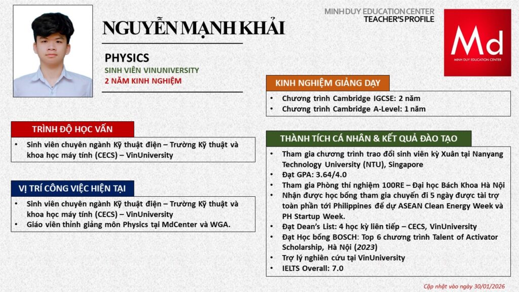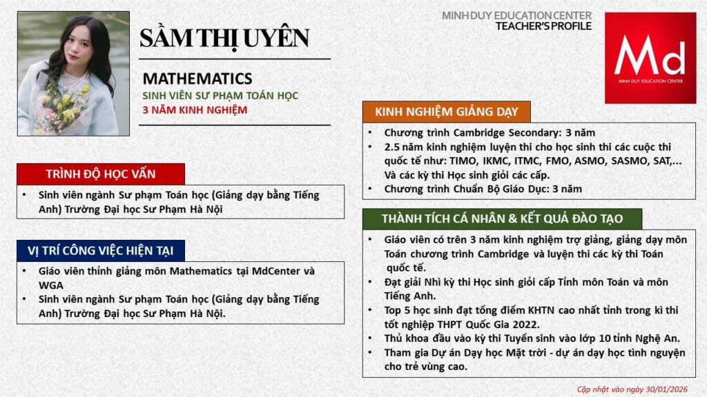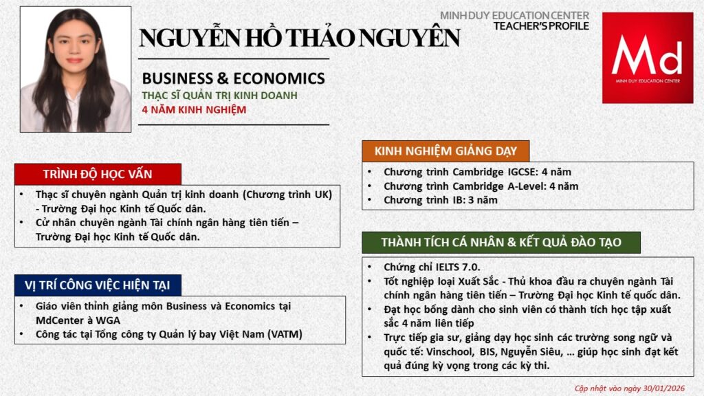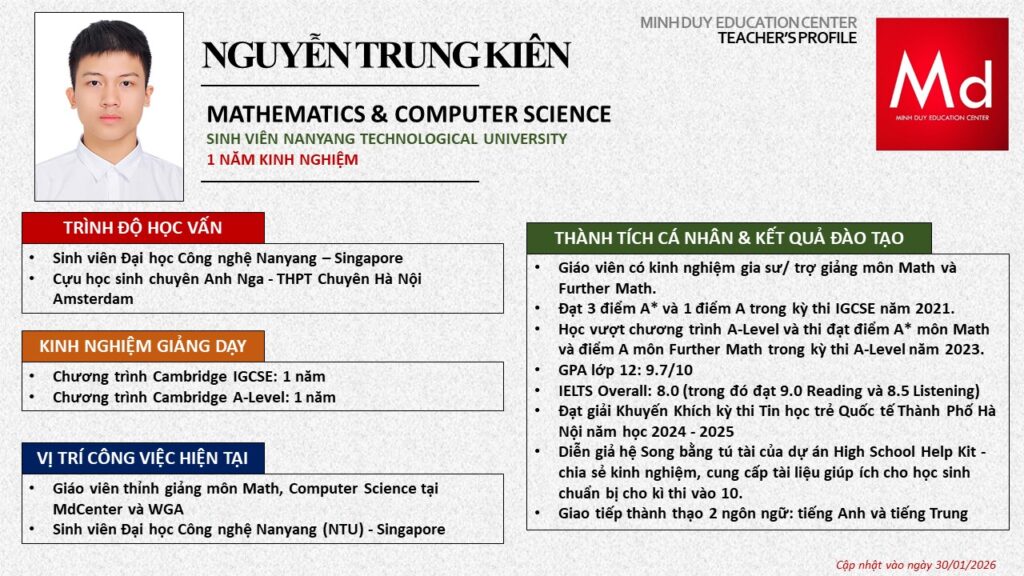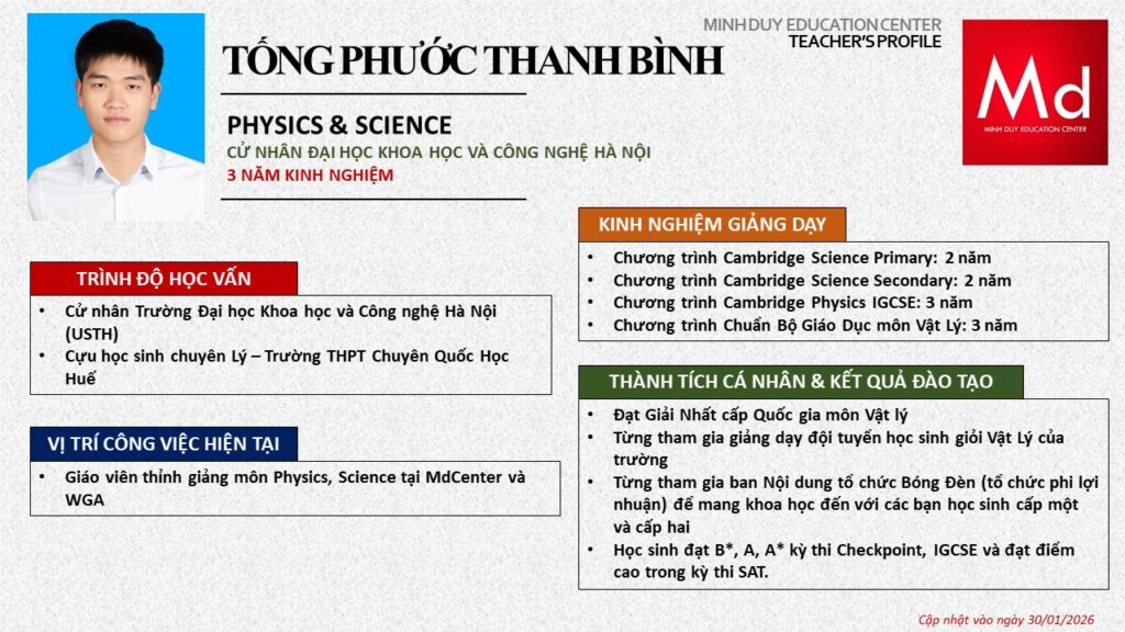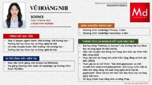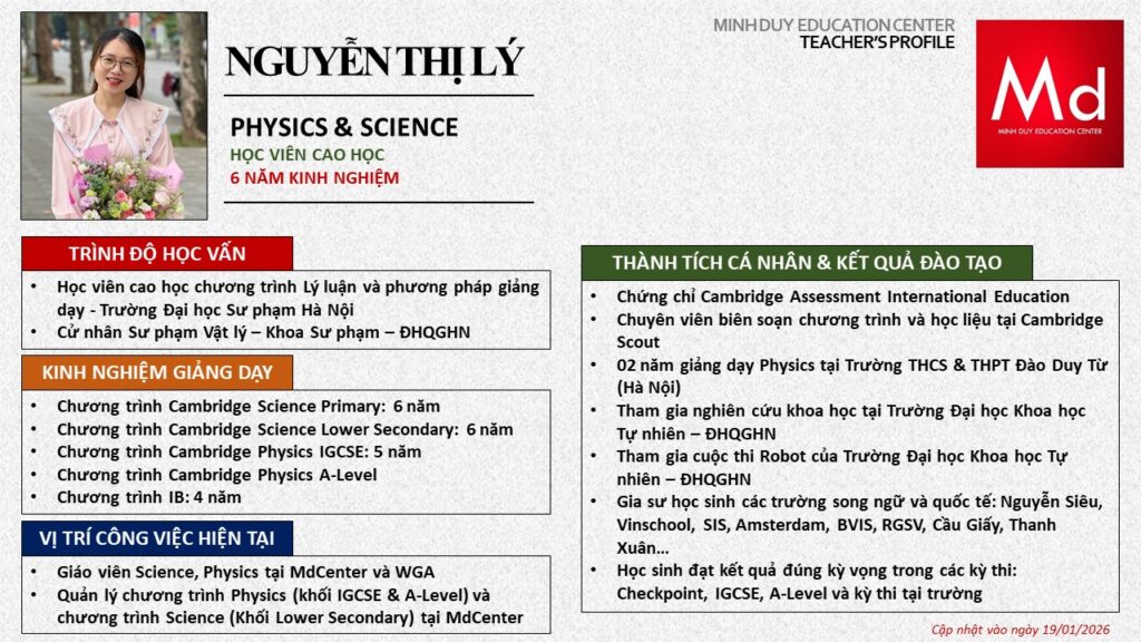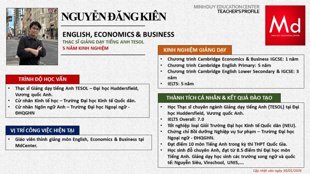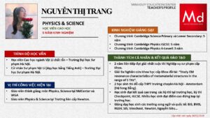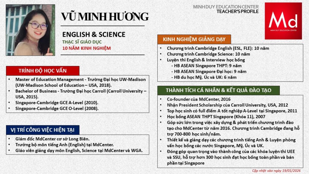 Bên cạnh đó, về chuyên môn đào tạo và giảng dạy, Minh Duycó kinh nghiệm đào tạo 15 môn học trong chương trình quốc tế Cambridge, IB và Common Core bao gồm: Mathematics, Physics, Chemistry, Biology, Science, Economics, Business, Global Perspectives, English, Accounting, Psychology, Sociology, Computer Science & Media Studies.