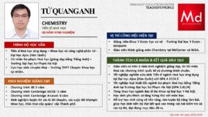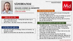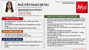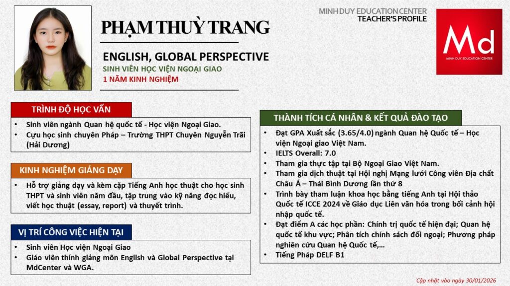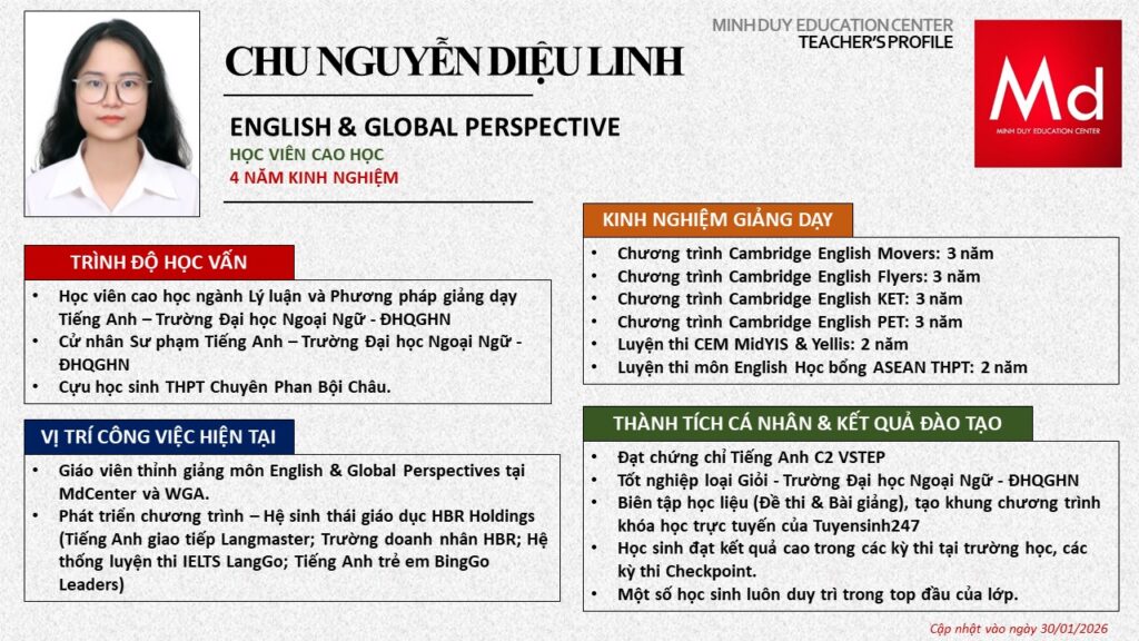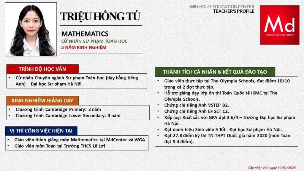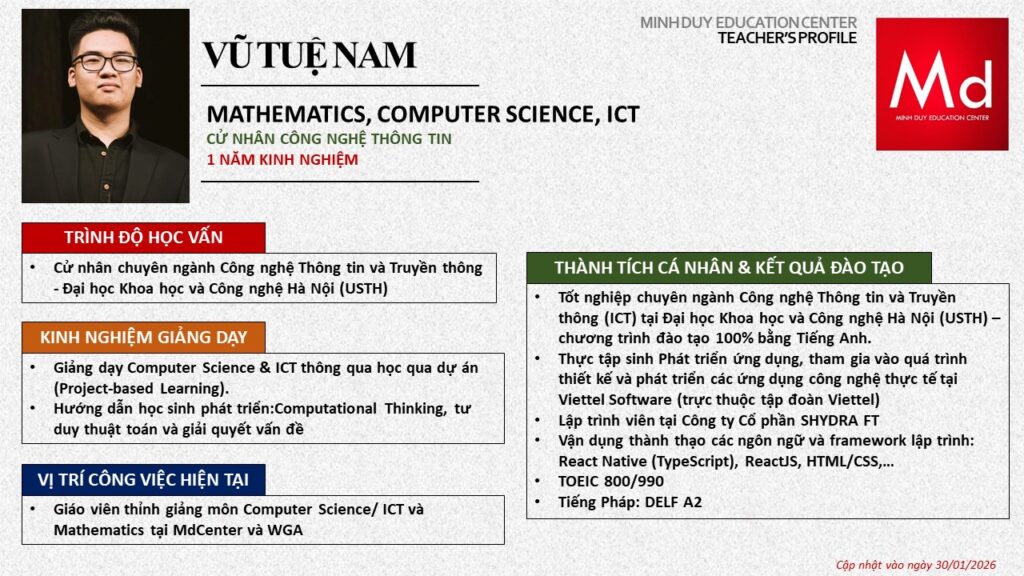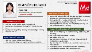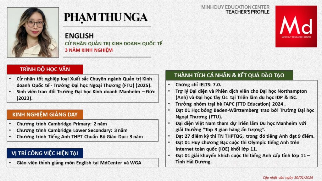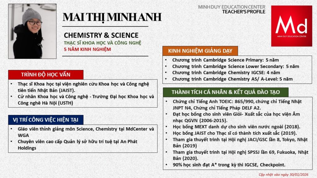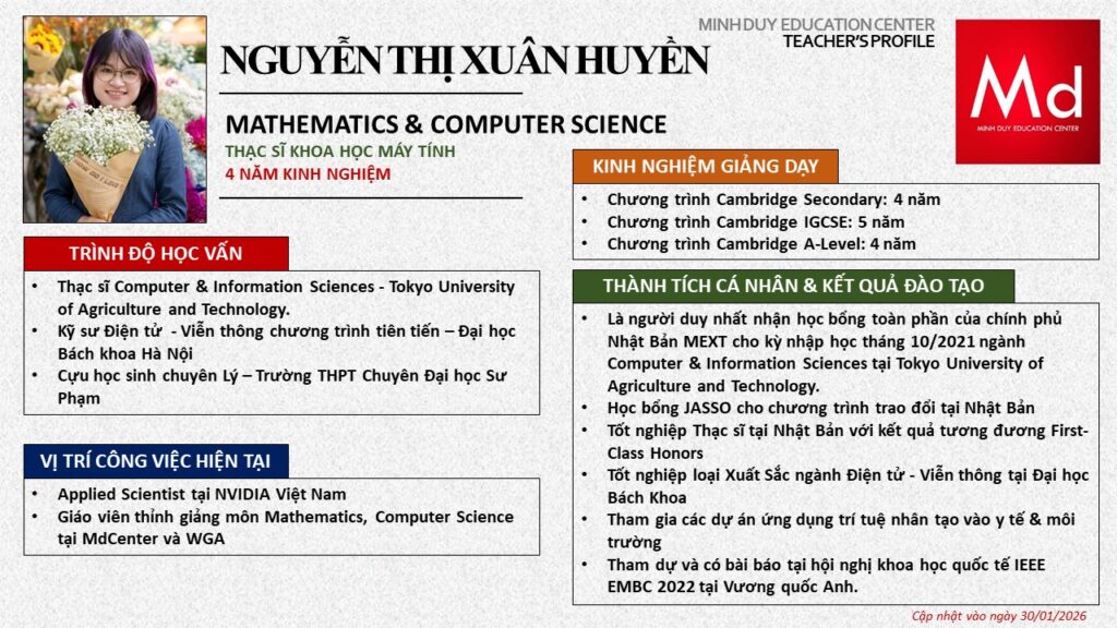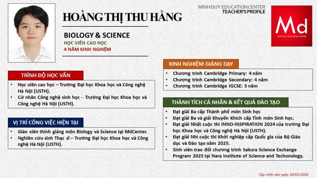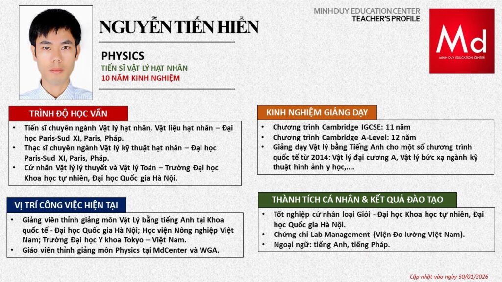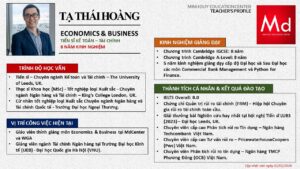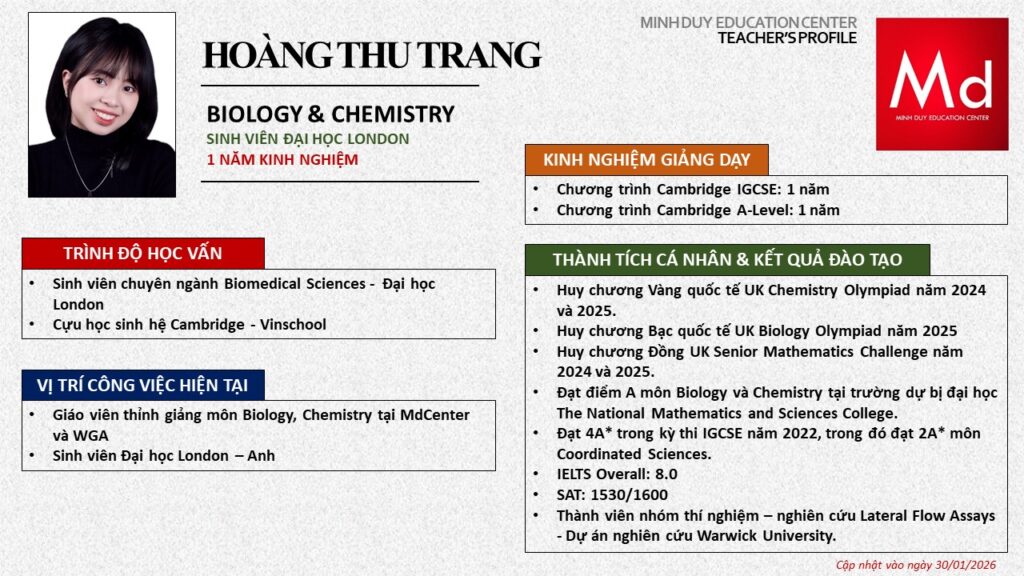 Bên cạnh đó, về chuyên môn đào tạo và giảng dạy, Minh Duycó kinh nghiệm đào tạo 15 môn học trong chương trình quốc tế Cambridge, IB và Common Core bao gồm: Mathematics, Physics, Chemistry, Biology, Science, Economics, Business, Global Perspectives, English, Accounting, Psychology, Sociology, Computer Science & Media Studies.
