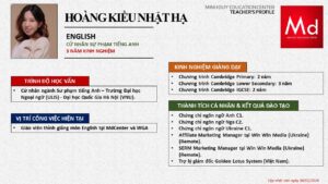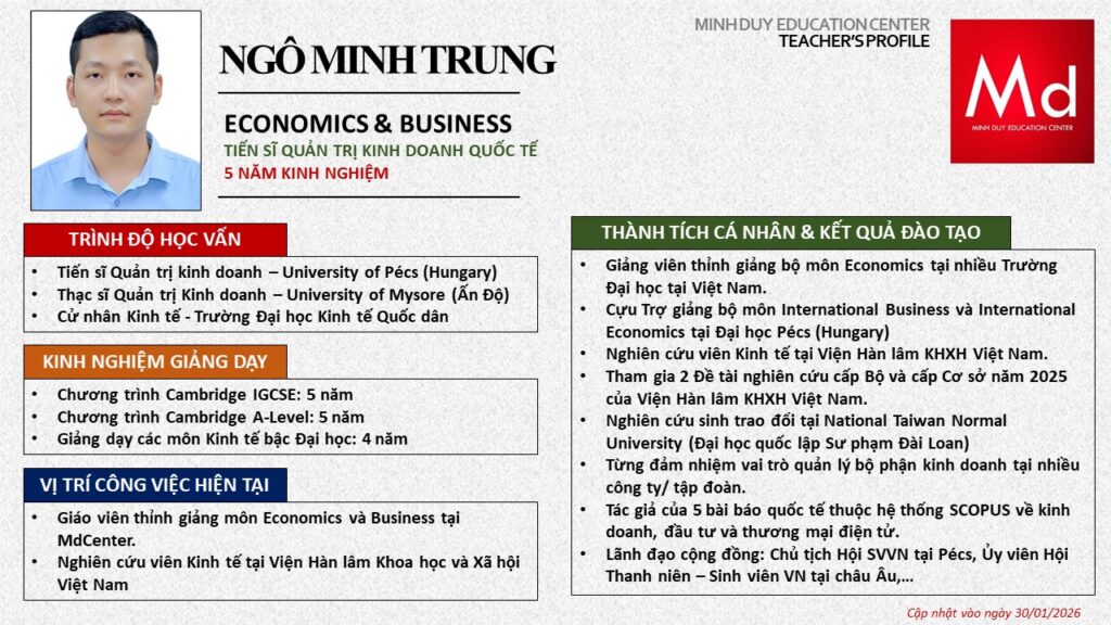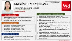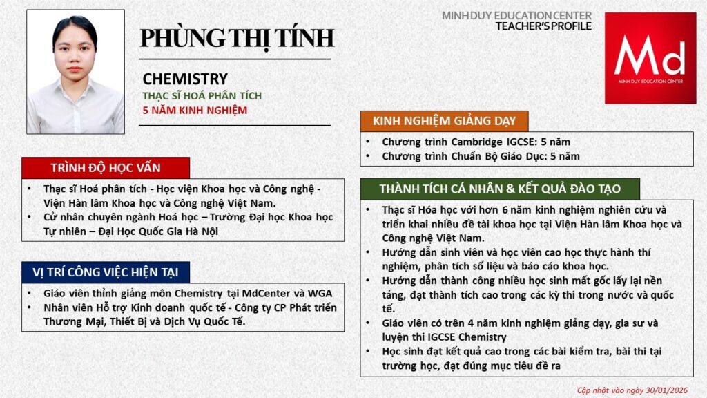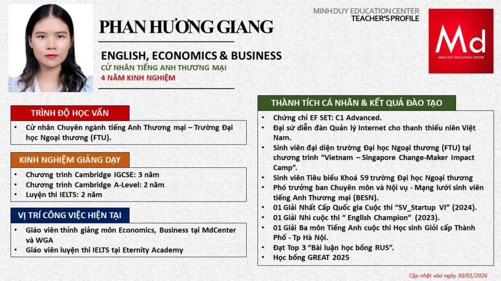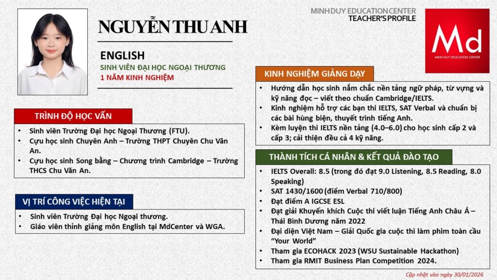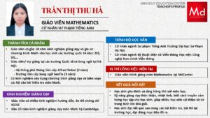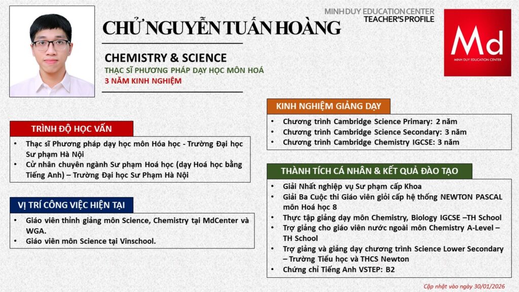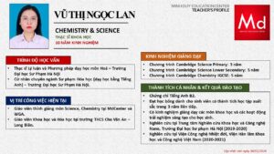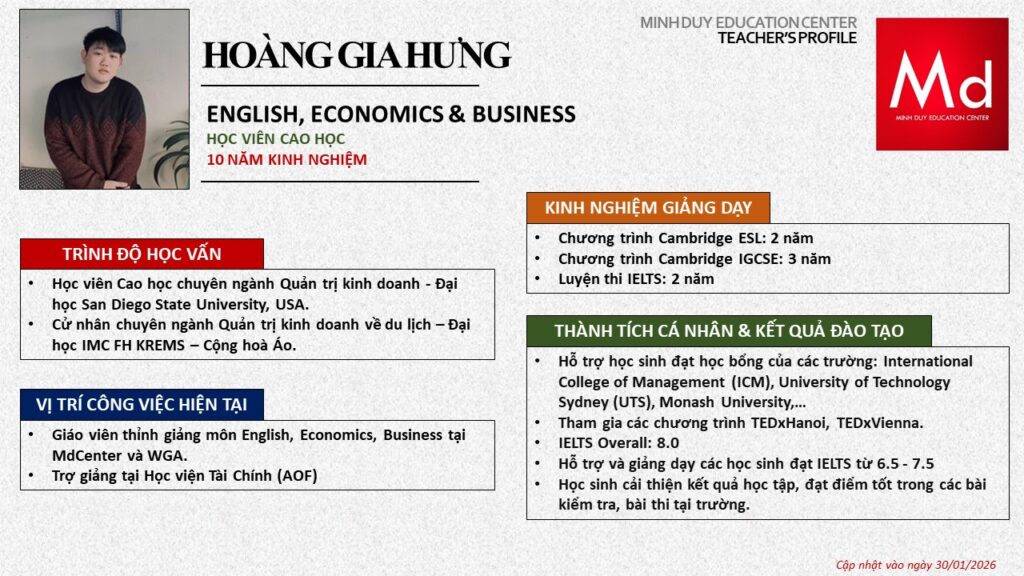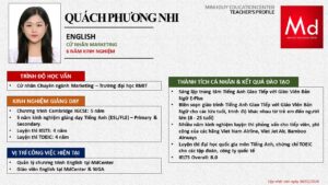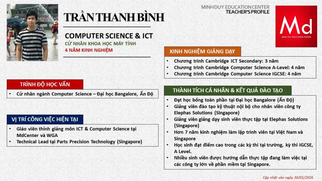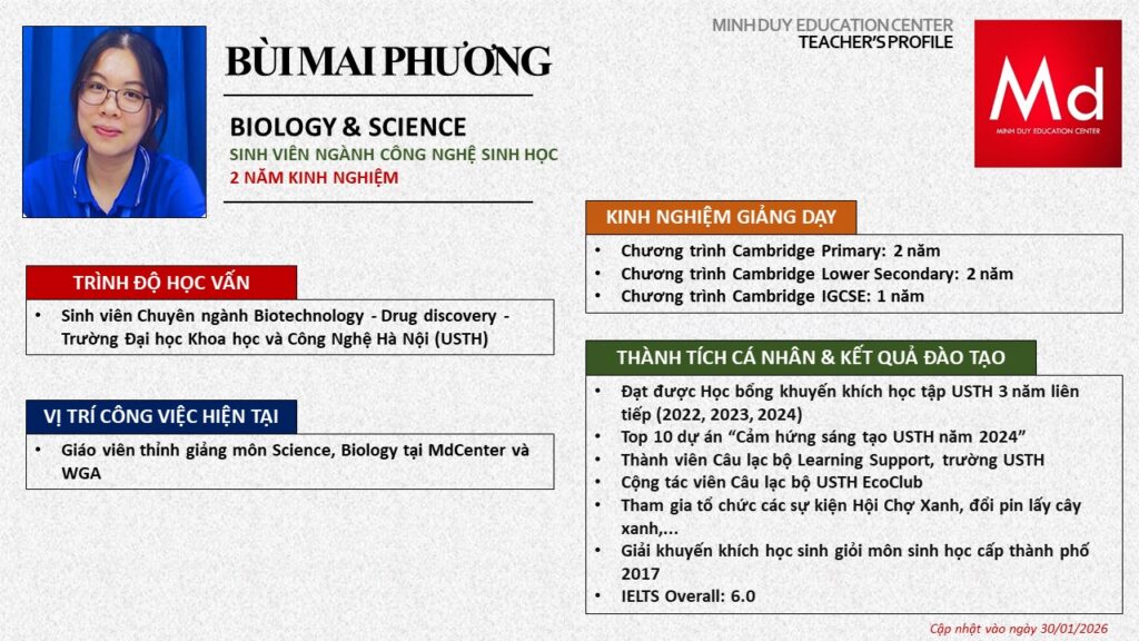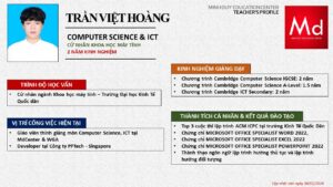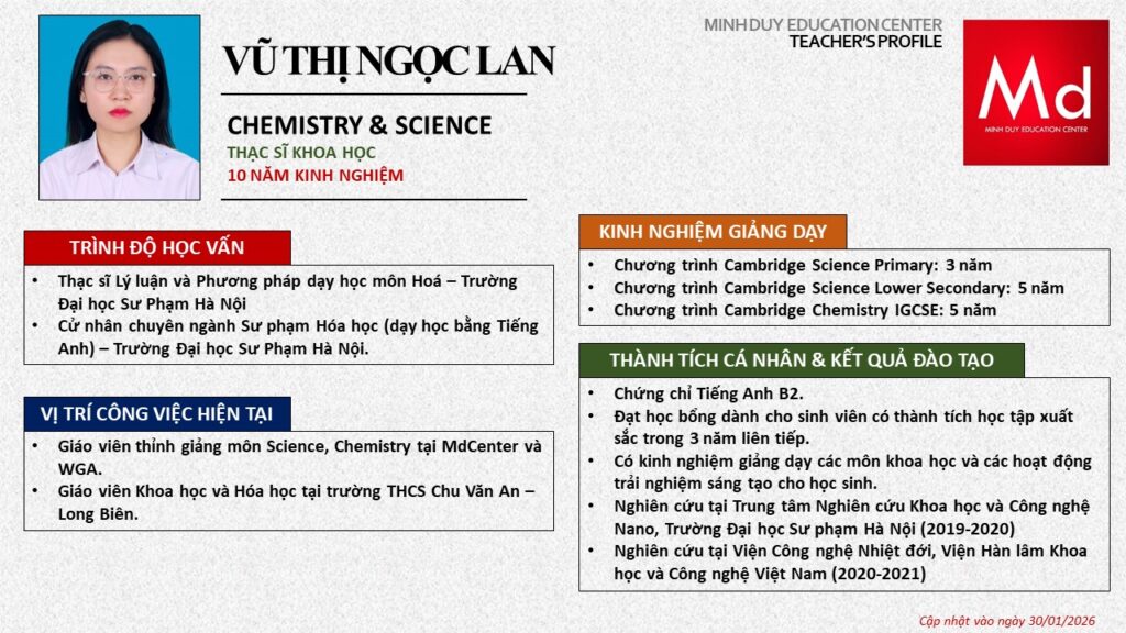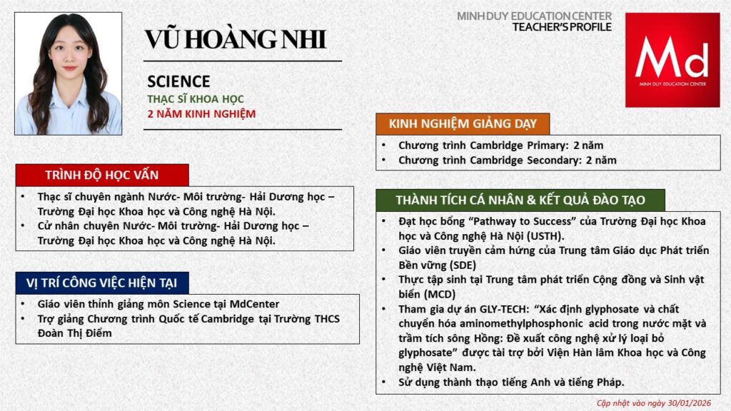 Bên cạnh đó, về chuyên môn đào tạo và giảng dạy, Minh Duycó kinh nghiệm đào tạo 15 môn học trong chương trình quốc tế Cambridge, IB và Common Core bao gồm: Mathematics, Physics, Chemistry, Biology, Science, Economics, Business, Global Perspectives, English, Accounting, Psychology, Sociology, Computer Science & Media Studies.